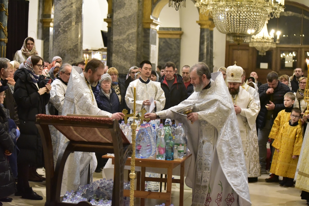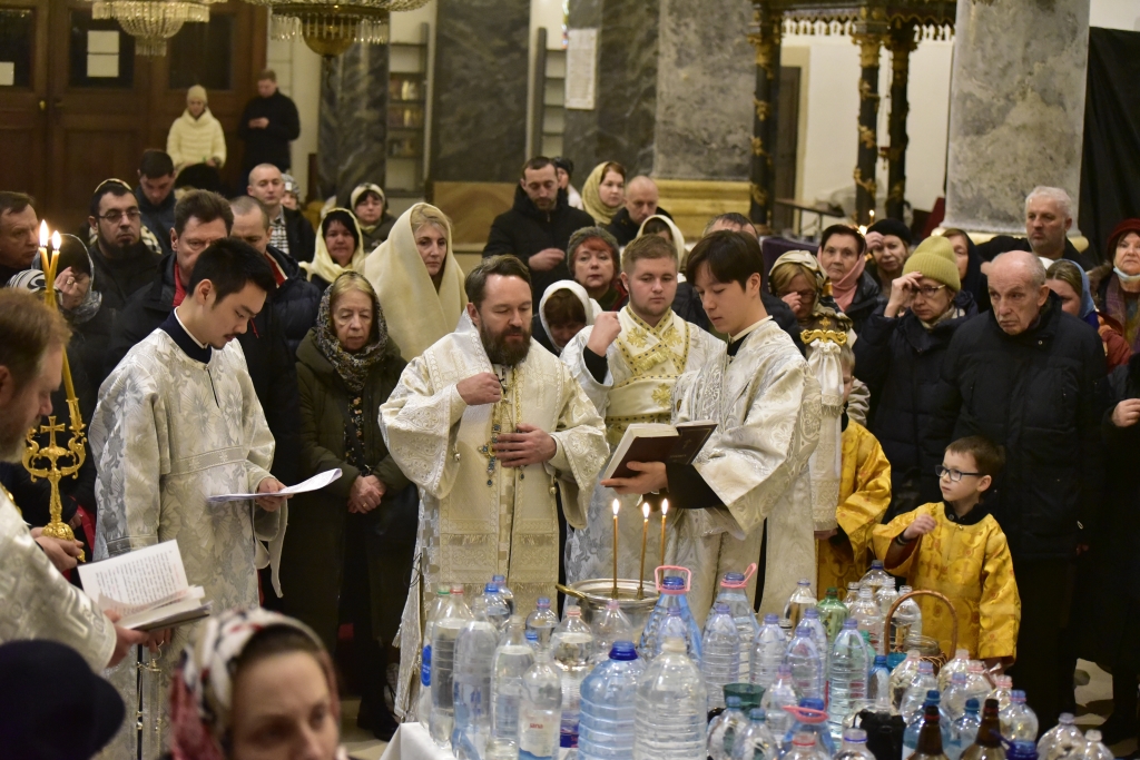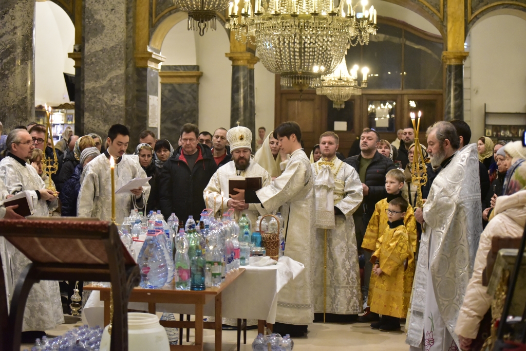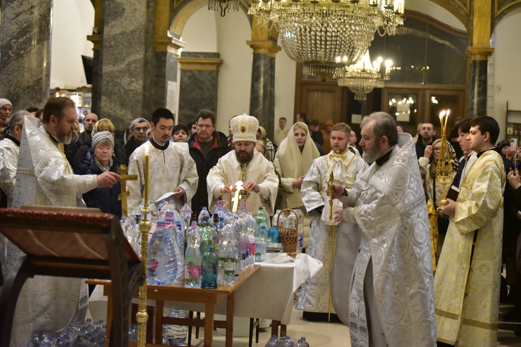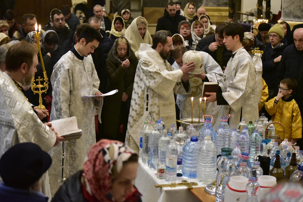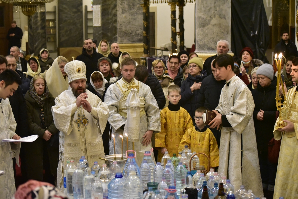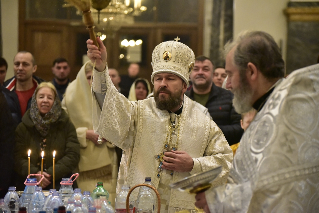 Так, после пения праздничных тропарей, чтения паремий, Апостола и Святого Евангелия, Высокопреосвященнейший Иларион, митрополит Будапештский и Венгерский перед емкостью с водой вознес освятительную молитву, испрашивая у Господа освятить эту воду, подать ей благодать избавления, благословение Иорданово, чтобы она стала источником нетления, очищения душ и телес, освящением домов.