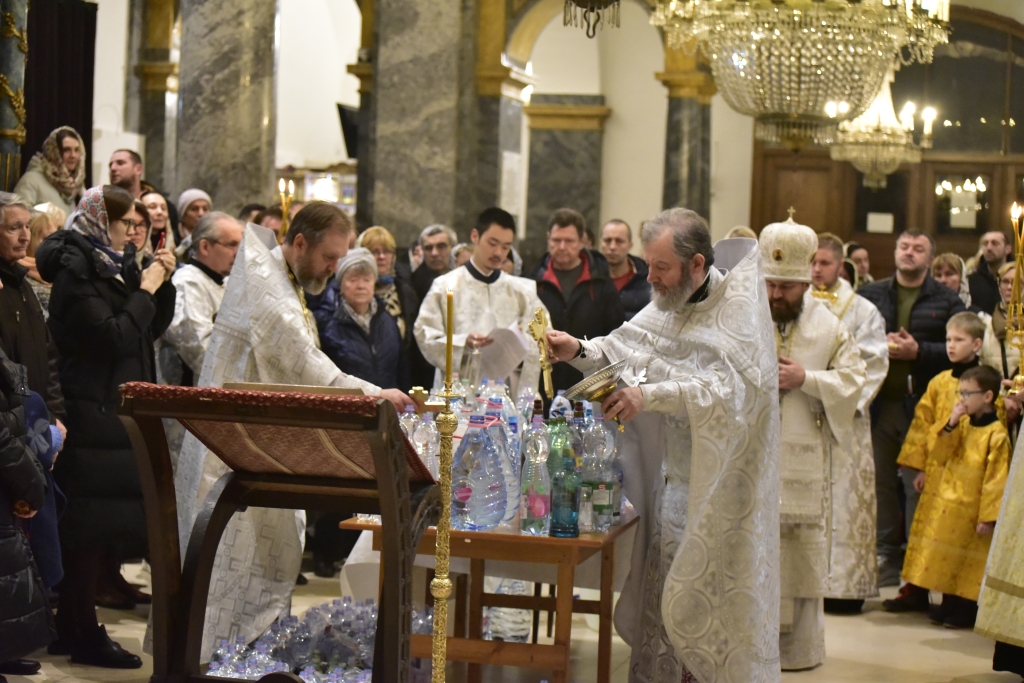По окончании богослужения, в воспоминание прославляемого ныне священного Иорданского события, глава Венгерской епархии в сослужении духовенства совершил чин великого освящения воды.