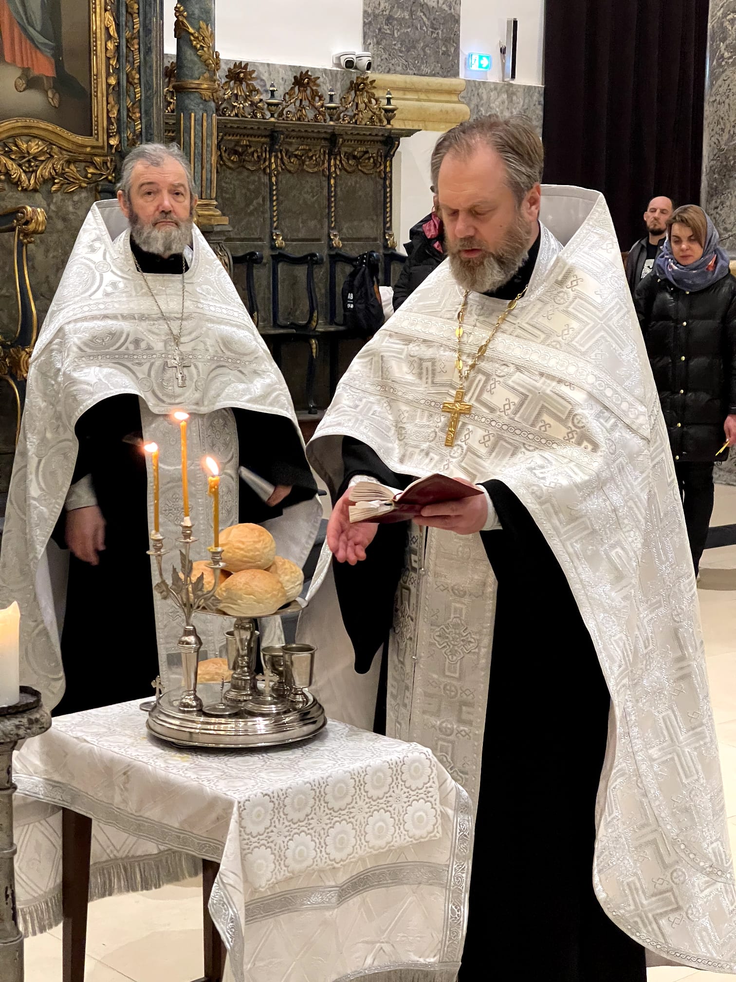 Торжественное всенощное бдение началось великим повечерием, по завершении которого настоятель Свято-Троицкого прихода иерей Димитрий в сослужении духовенства совершил чинопоследование литии, благословив во время него хлеб, пшеницу, вино и елей.