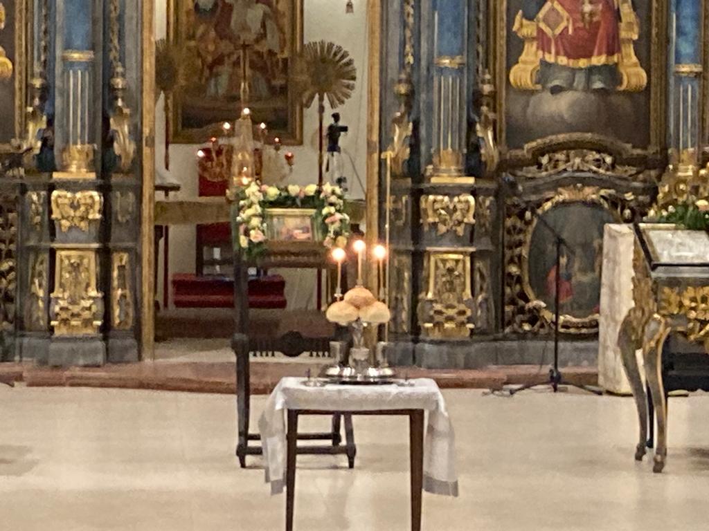 Далее священнослужителями было совершено чинопоследование литии, в завершение которой отец Димитрий благословил хлеб, пшеницу, вино и елей.