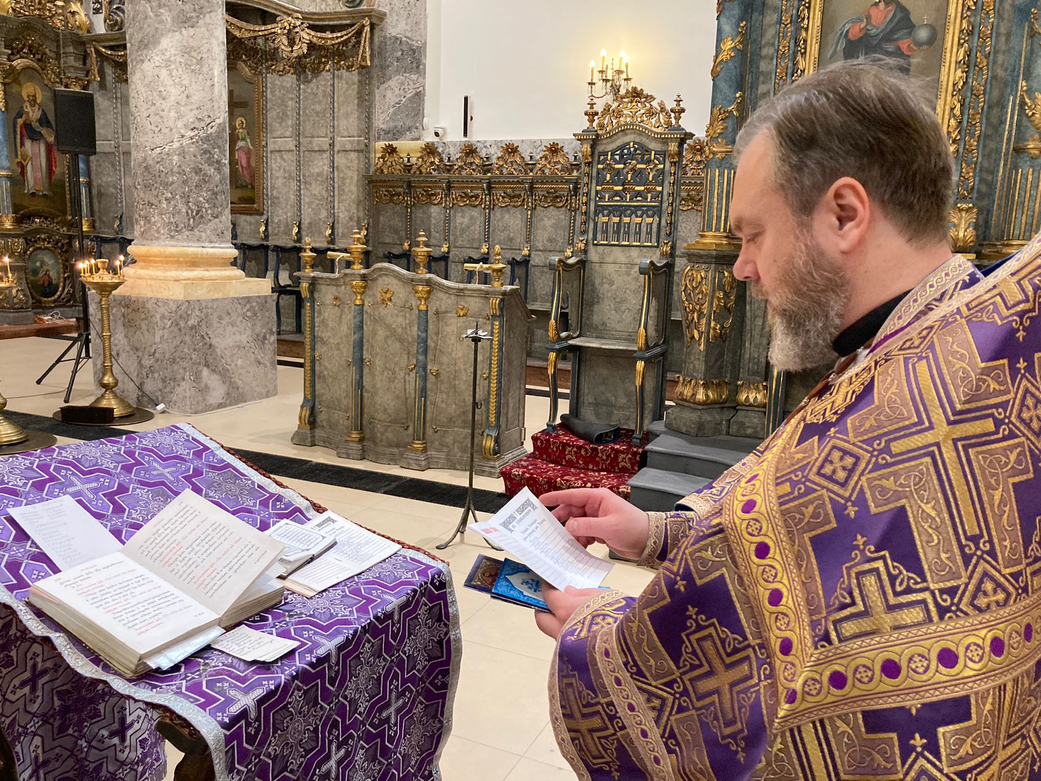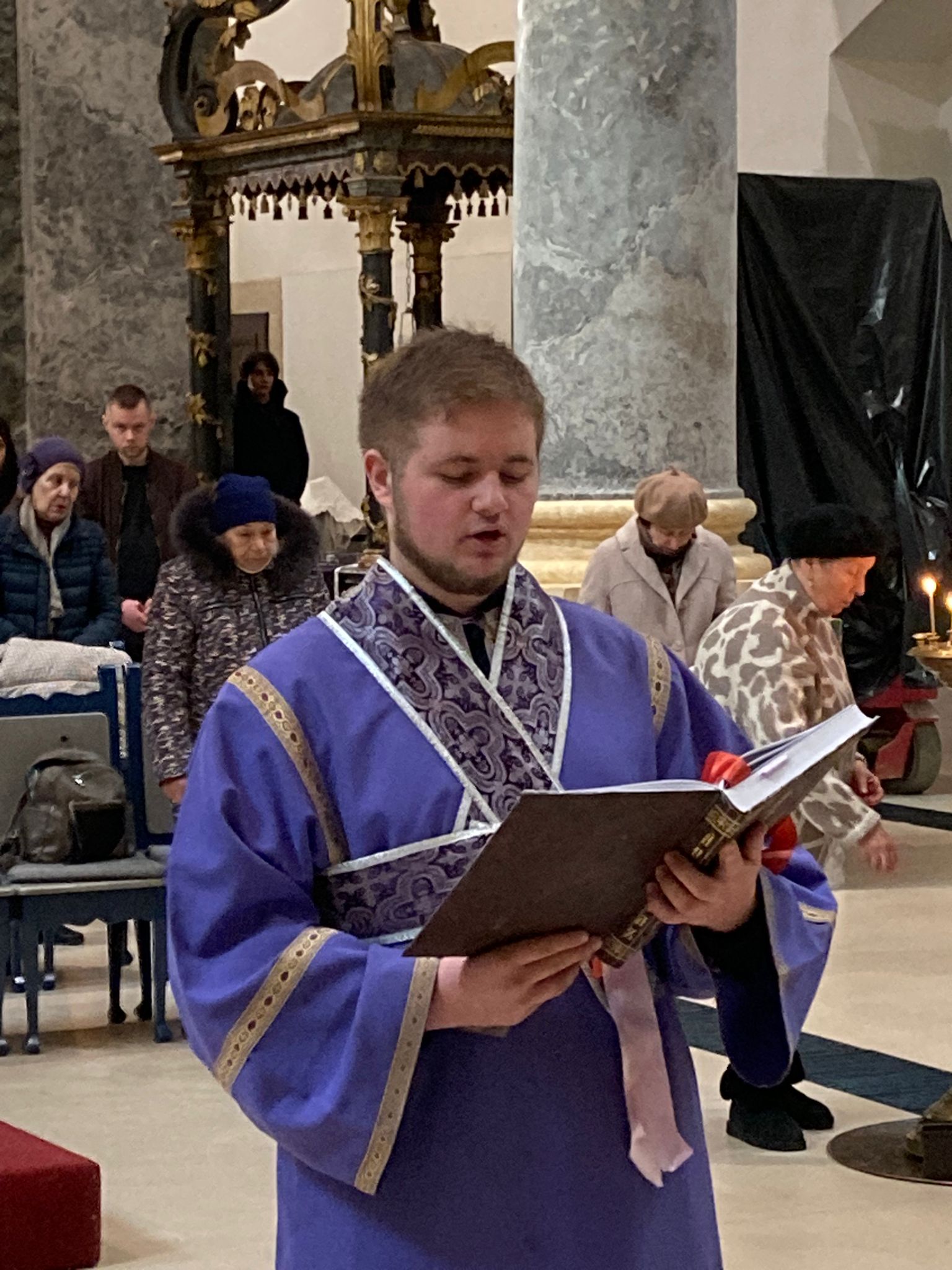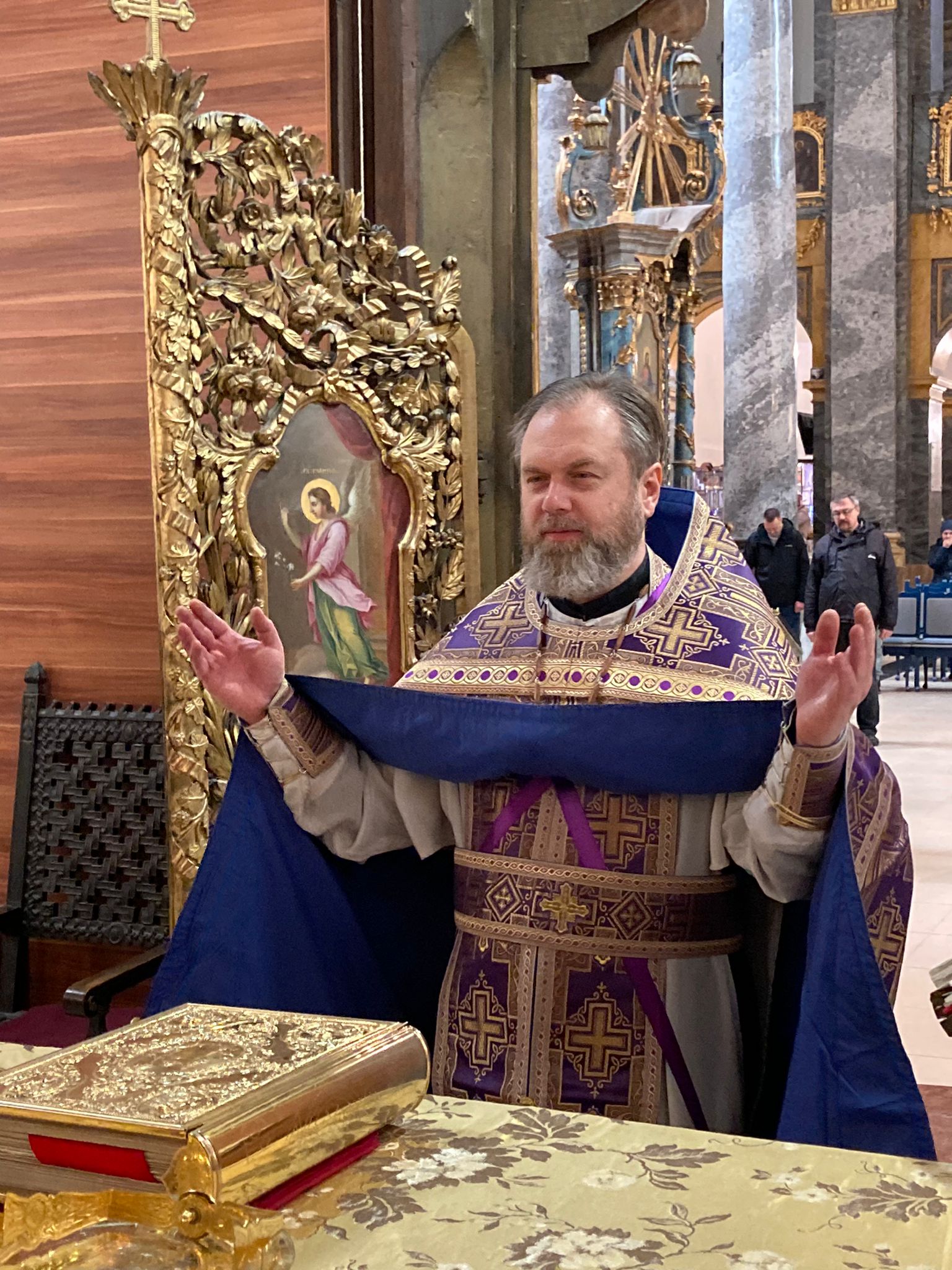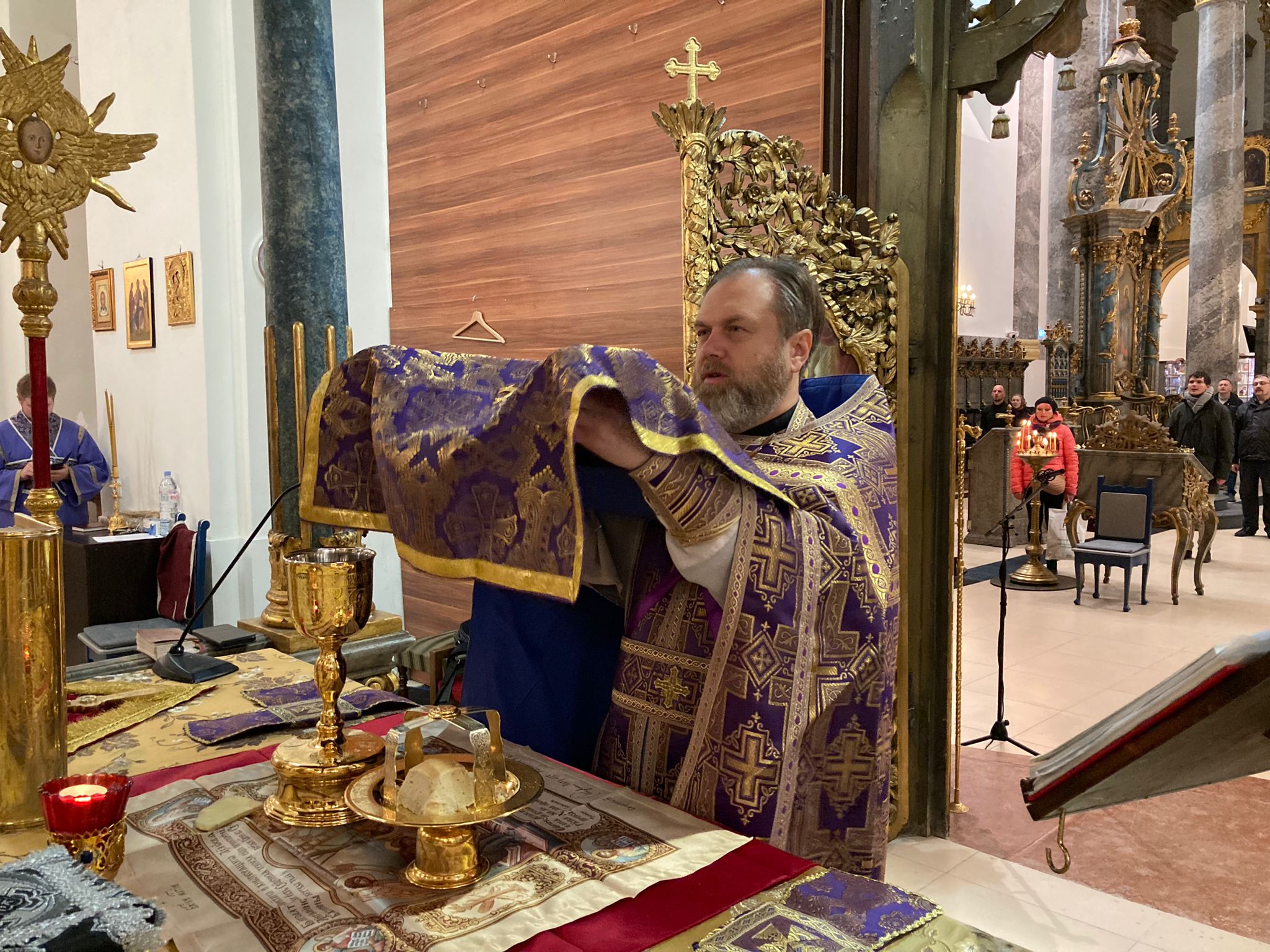 Молитвенные песнопения исполнили певчие приходского хора под управлением Евы Гволик. На сугубой ектении была прочитана молитва о восстановлении мира. Перед выносом Святых Даров и причащением отец Димитрий произнес проповедь.