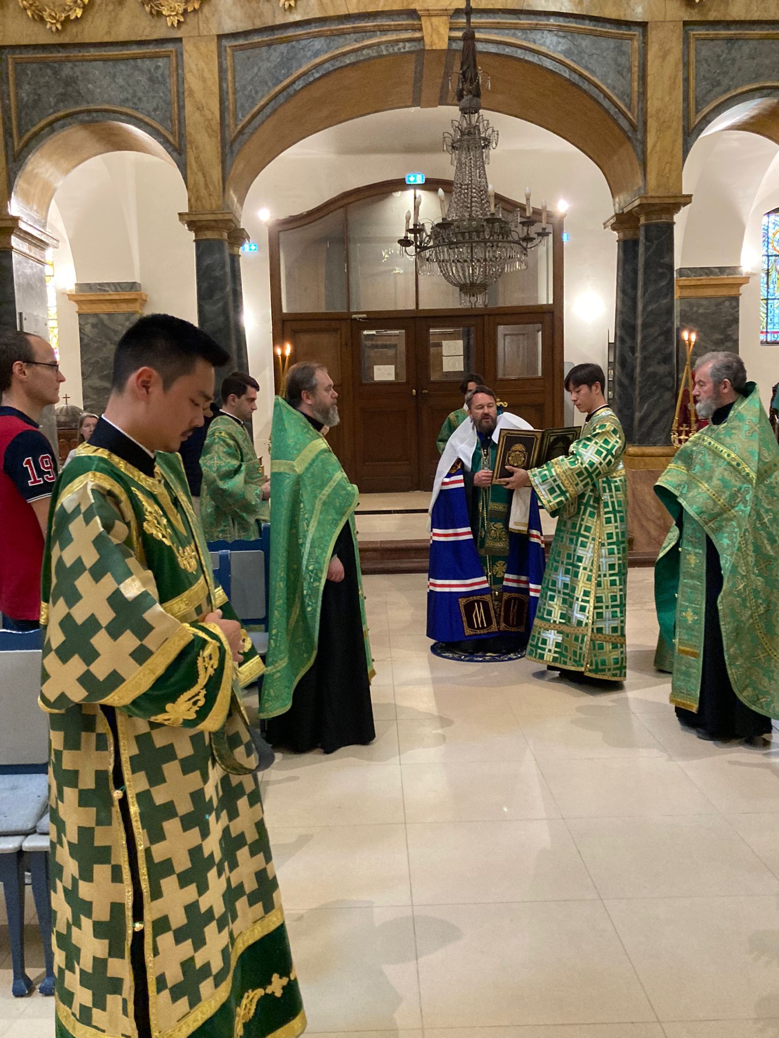 Диаконский чин представил архиерейский диакон Вячеслав Ли. День Святой Троицы, празднуемый на пятидесятый день после Светлого Христова Воскресения, – один из важнейших двунадесятых торжеств. В этот день исполнились надежды и чаяния ветхозаветных пророков и праведников, ожидавших благодатного соединения человека с Богом, жаждавших нового духовного союза Творца со Своим творением.