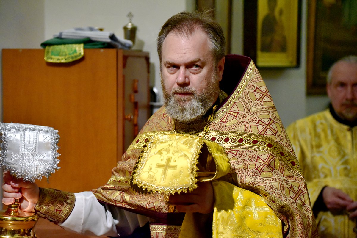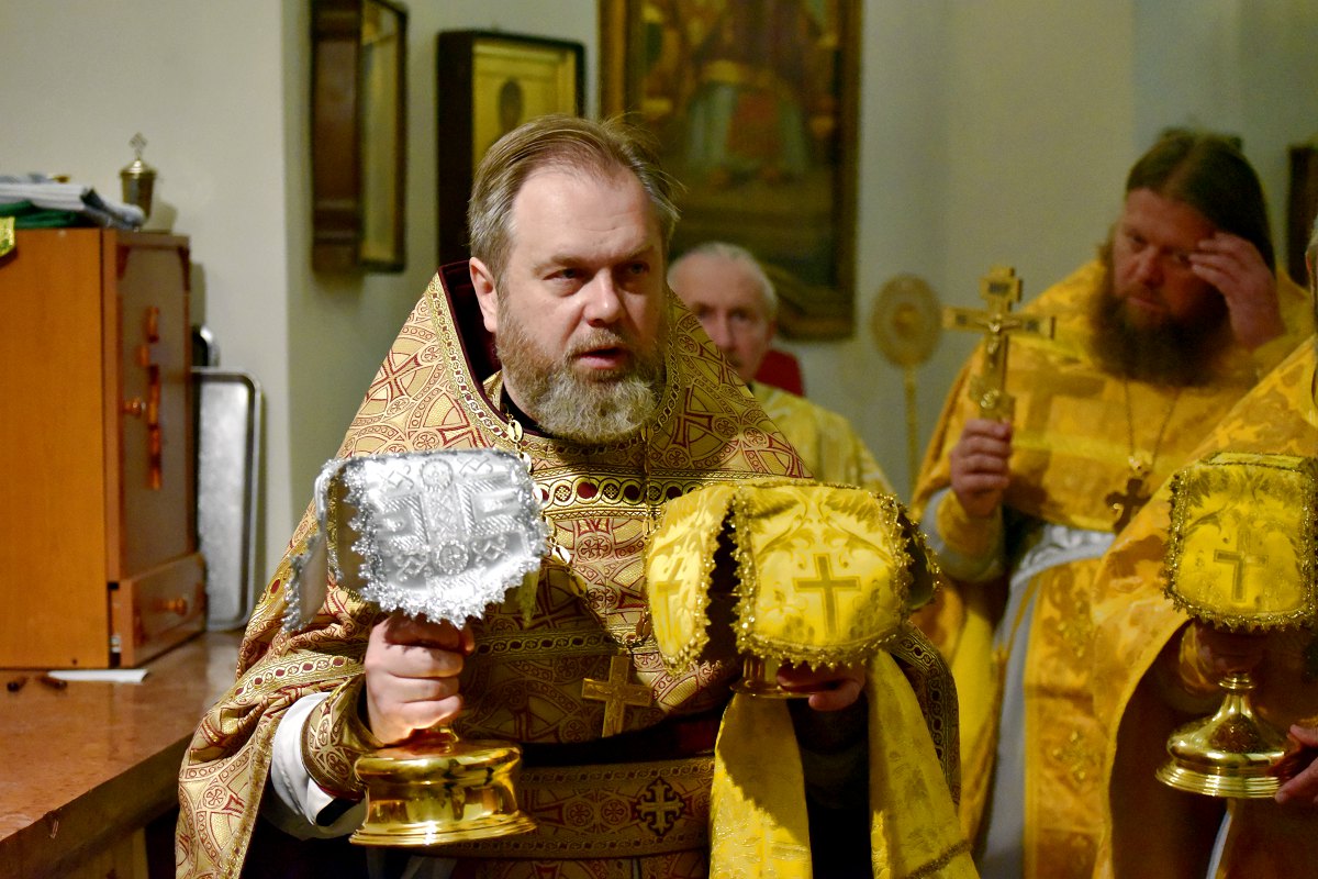 Перед Выносом Святых Даров настоятель прихода произнес проповедь, в которой рассказал о великих подвигах исповедания Господа прославляемыми сегодня святыми.