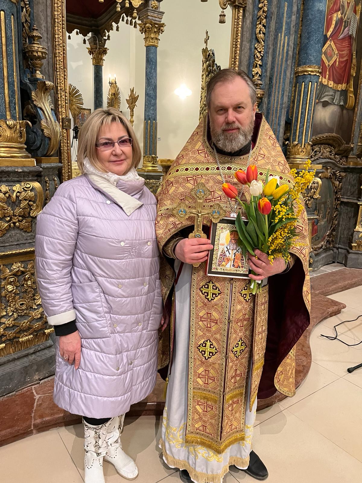 От Свято- Троицкого прихода произнесла поздравления и вручила цветы и памятный подарок Светлана Славинская. В свою очередь, отец Димитрий поблагодарил всех присутствующих за добрые пожелания, поздравления и молитвы.