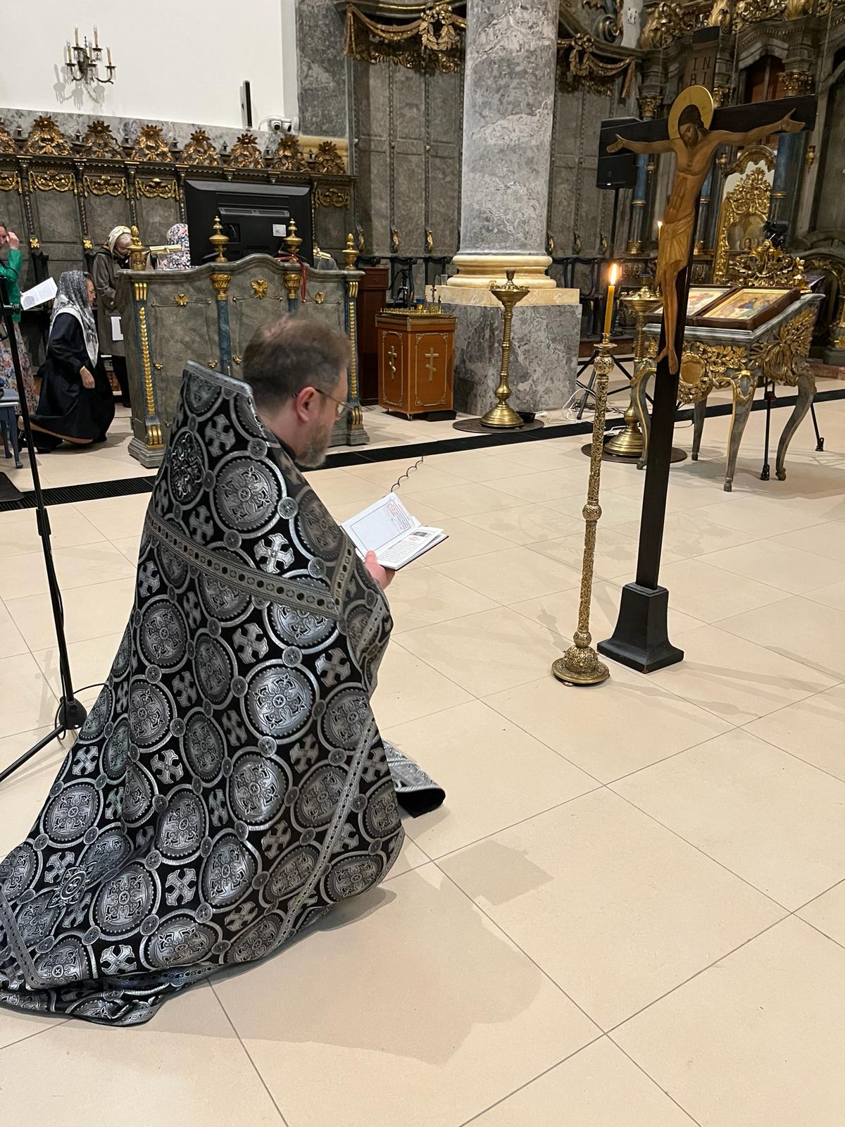 Перед Распятием было совершено пение акафиста Страстям Христовым и прочитано Евангелие от Марка, благовествующее о событиях Страстной седмицы. Также была вознесена молитва Иисусу Христу Распятому.