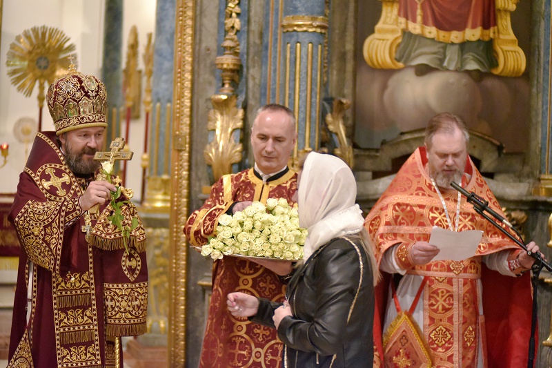 После причащения прихожан Святыми Христовыми Тайнами митрополит Иларион поздравил всех женщин, присутствующих в храме, вручив им красивые белые розы.