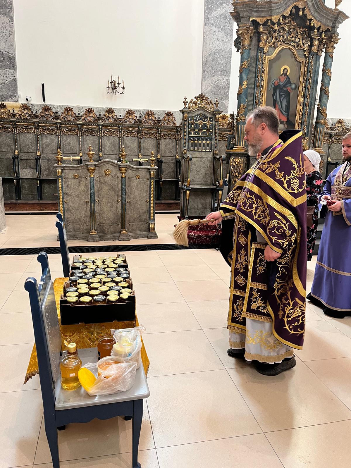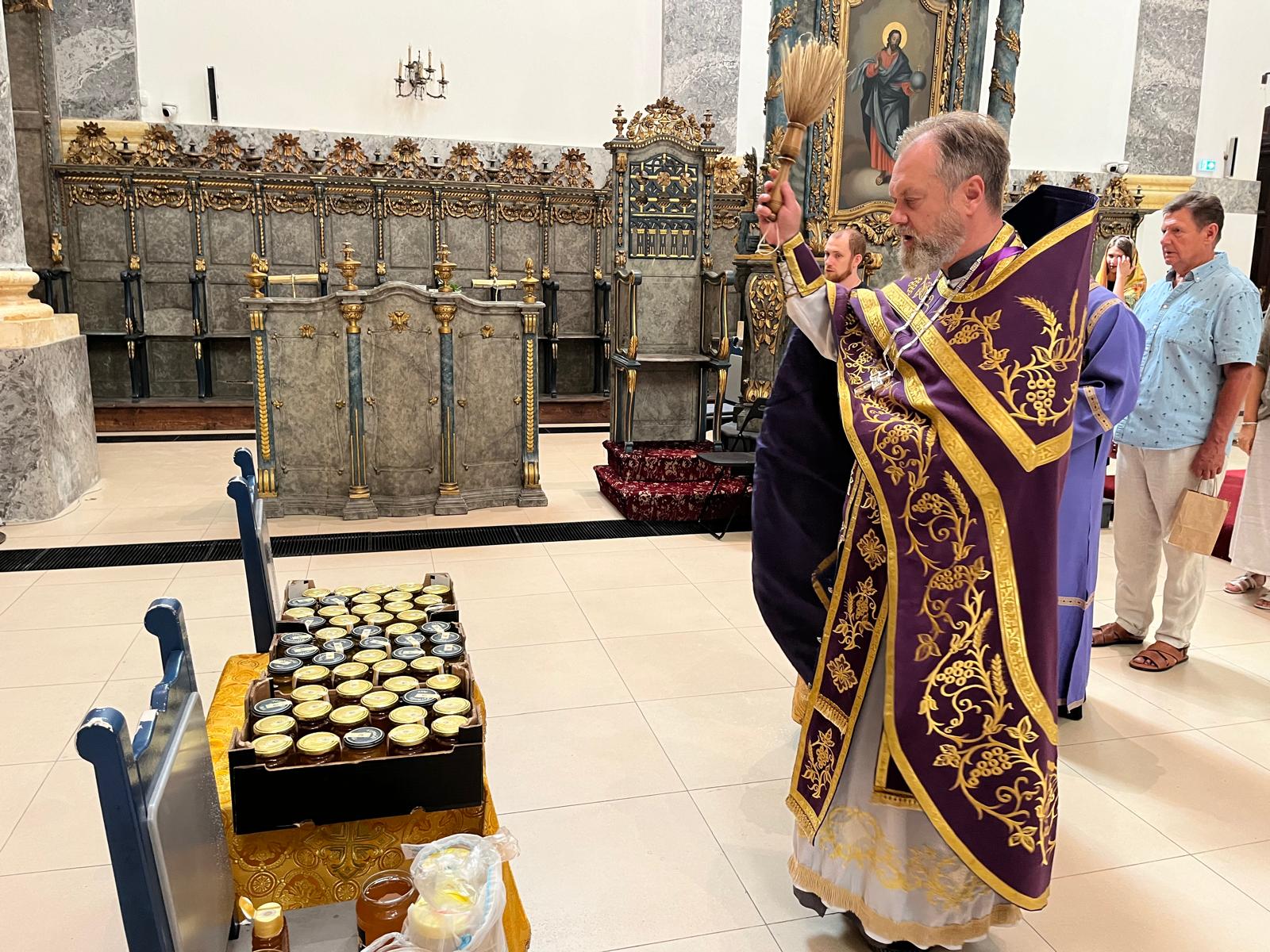 По окончании Божественной литургии, после заамвонной молитвы состоялось освящение принесенного прихожанами меда.