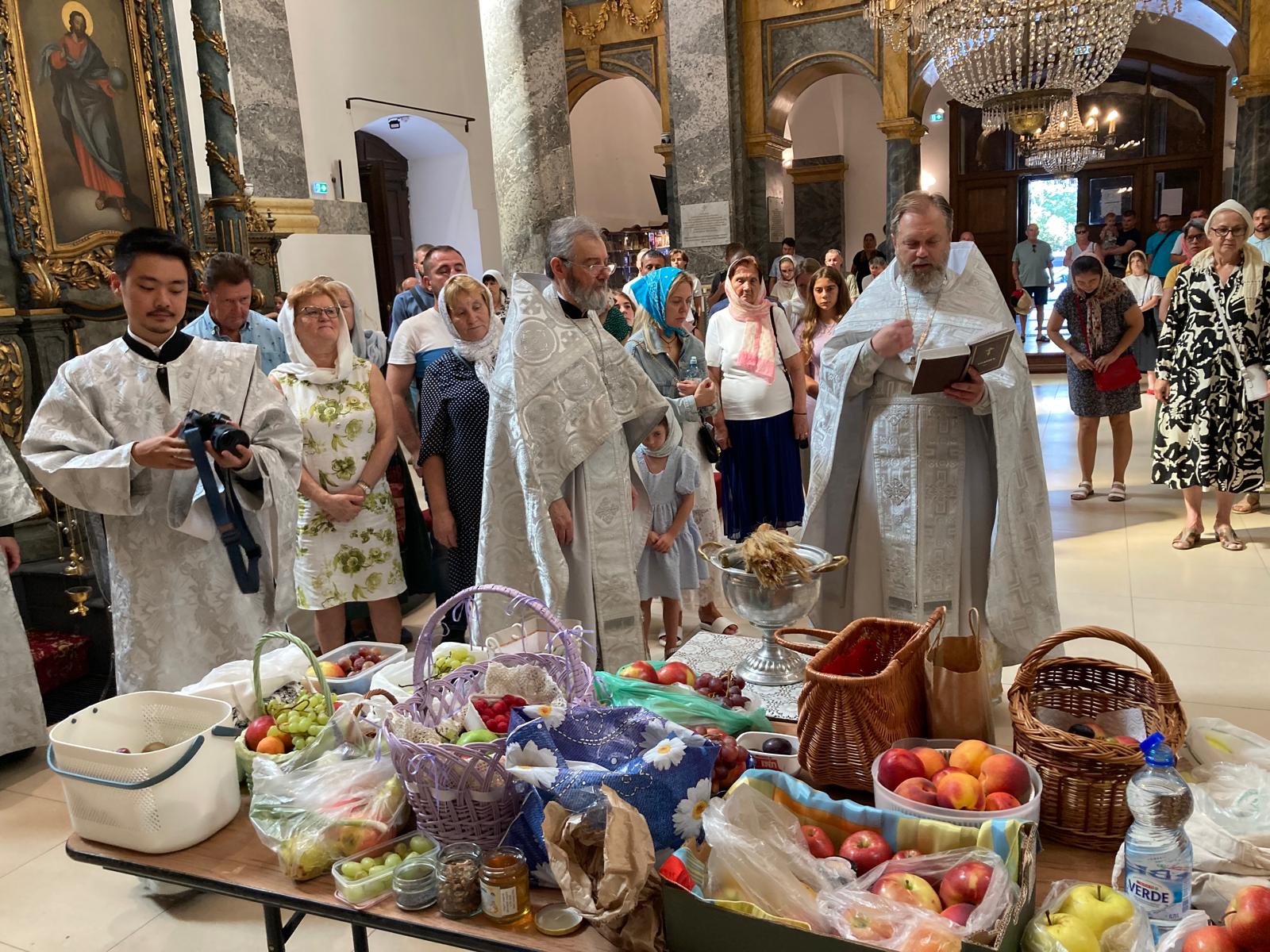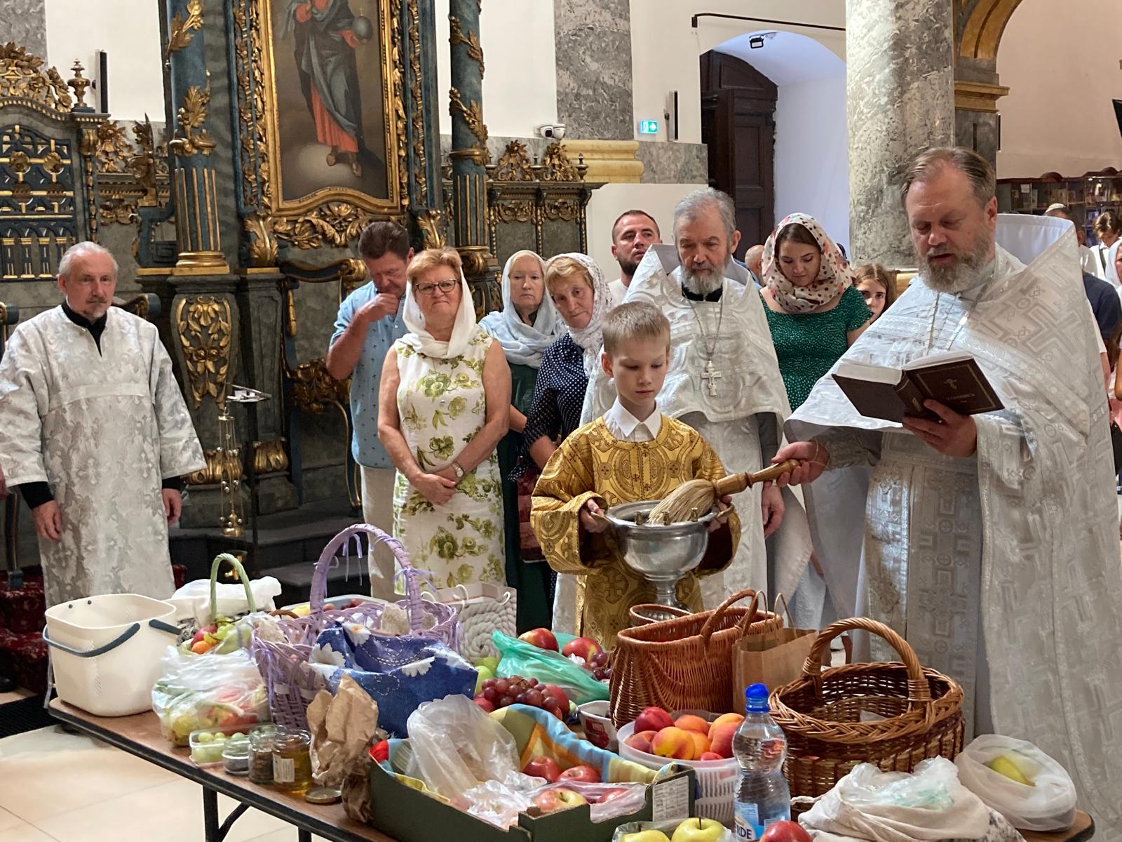 Богослужебной особенностью церковного праздника был совершенный чин освящение плодов. После заамвонной молитвы, при пении тропаря и кондака отец Димитрий совершил окропление святой водой принесенных прихожанами фруктов и овощей.