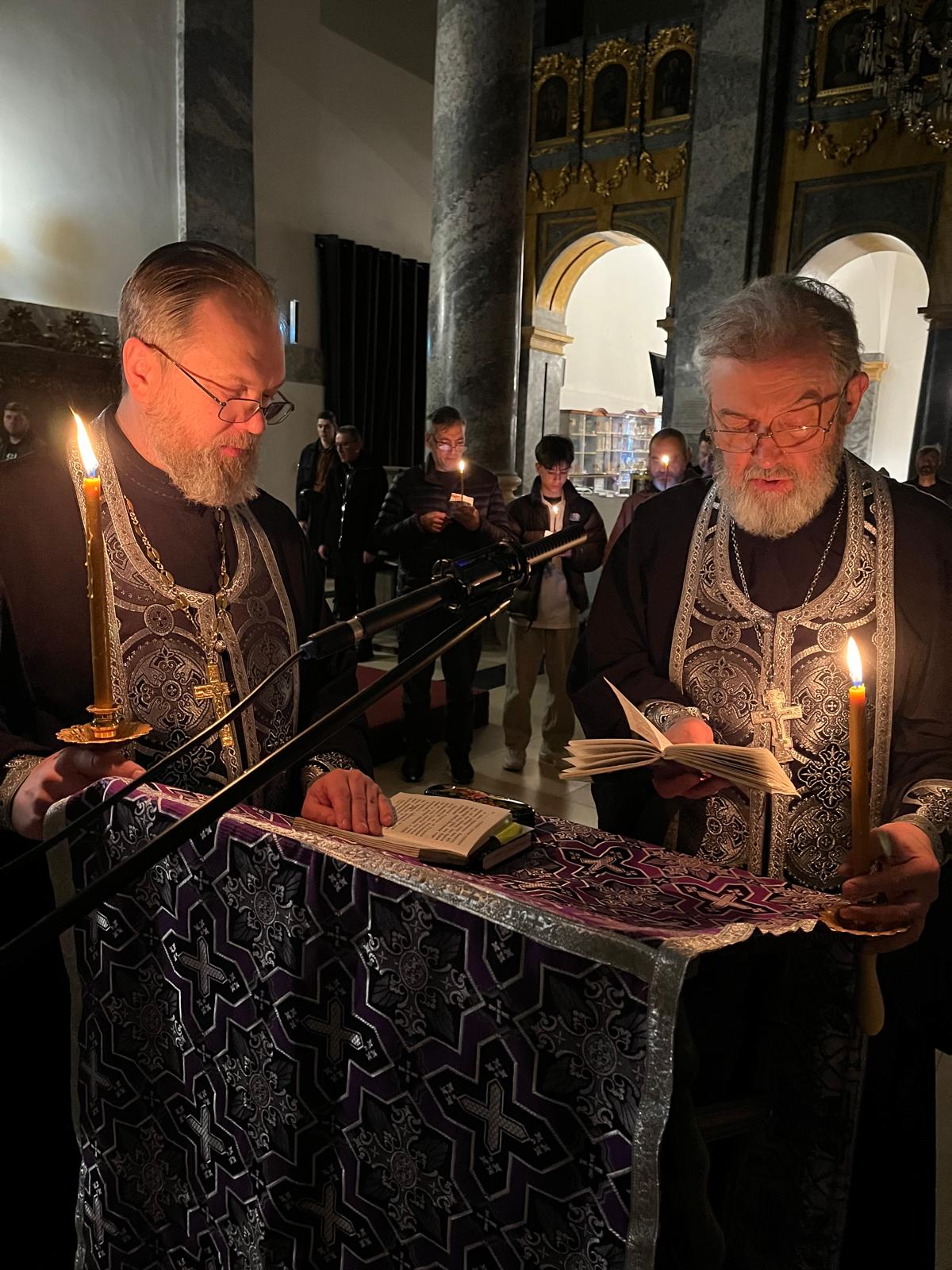 Последование великого повечерия начал иерей Святослав. Затем на середину храма вышел настоятель прихода иерей Димитрий и приступил к покаянному тексту. Каждый тропарь Великого канона завершался псаломским припевом хора: «Помилуй мя, Боже, помилуй мя».