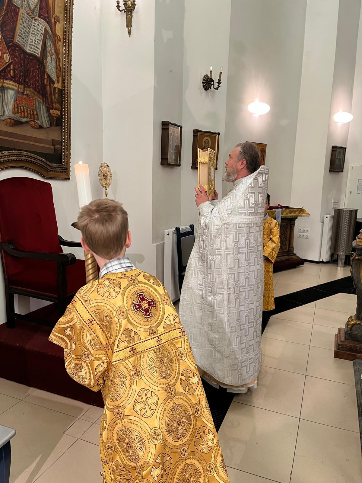 В евангельском зачале, прочитанном иереем Димитрием, был представлен подробный рассказ апостола Матфея о чудесном событии Преображения Господа Иисуса Христа на вершине горы Фавор. Описывая это явление, святой евангелист отметил также и глубокое чувство внутреннего ликования апостола Петра, целиком овладевшего им на тот миг от причастности дарам благодати Сына Божия.