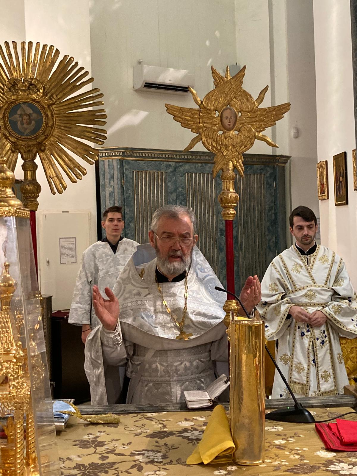 Утром 24 августа 2025 года, в Неделю 11-ю по Пятидесятнице, в Свято- Троицком приходе Успенского кафедрального собора состоялась Божественная литургия, возглавил которую настоятель прихода иерей Димитрий Корнилов. Ему сослужил священник прихода Святослав Булах.