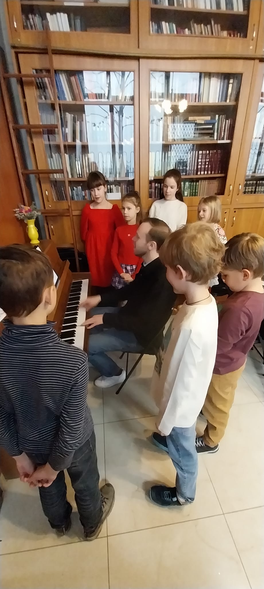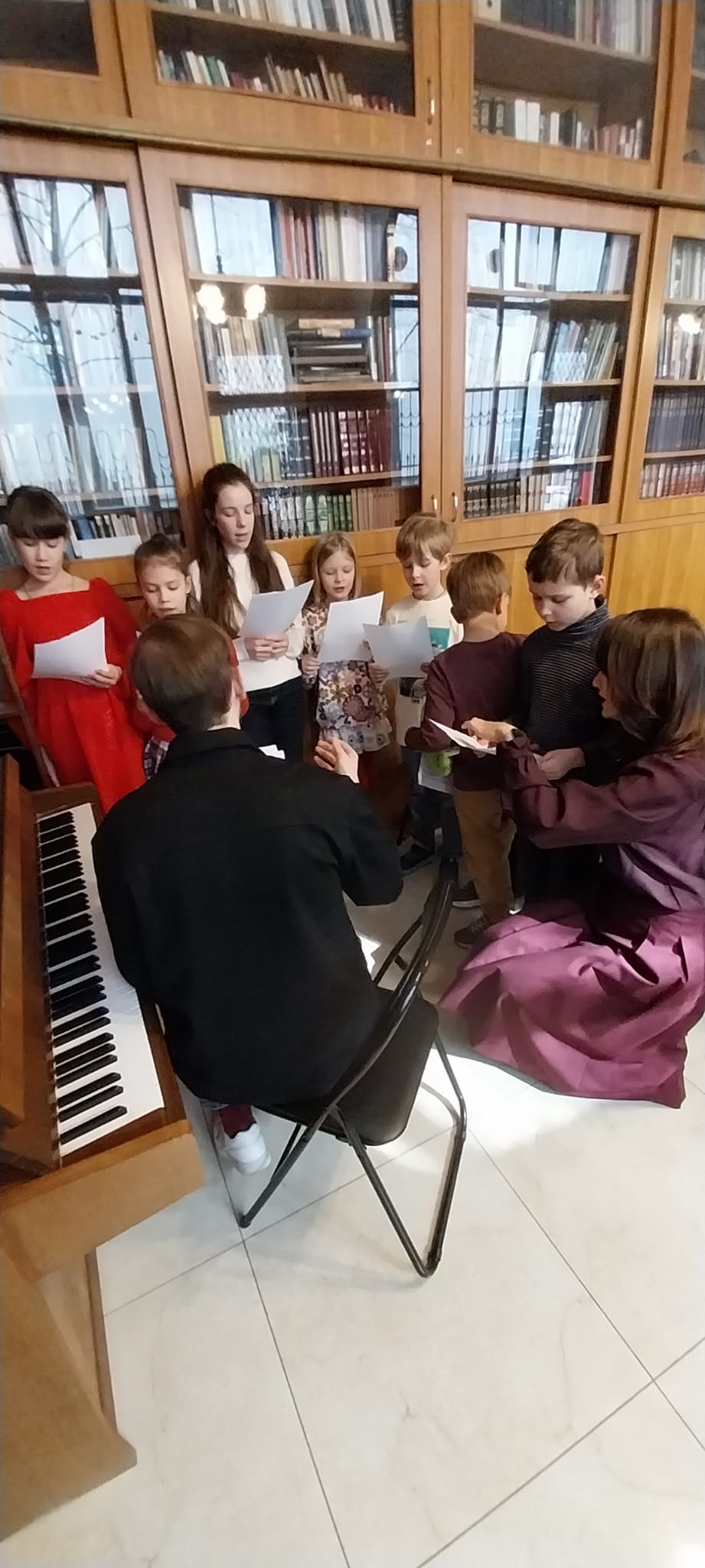 Во второй части занятия состоялся музыкальный урок. Ребята продолжили знакомство с церковным и христианским пением, а также разучивали новые христианские песни под аккомпанемент фортепиано. Во время занятия дети учились петь вместе, слушать друг друга и сохранять общее звучание. Музыкальные занятия помогают развивать слух, чувство ритма и интерес к совместному пению.
