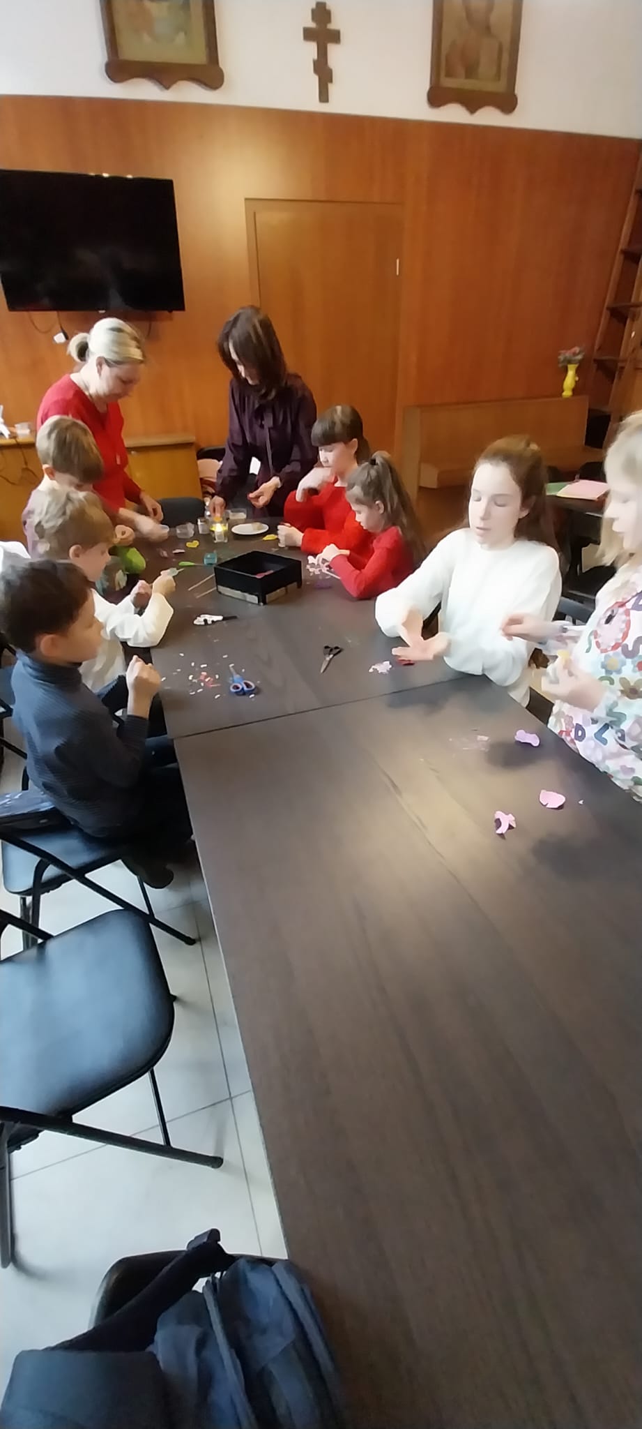 Прочитав детские стихотворения, посвящённые Великому посту, занятия продолжила преподаватель Анна Ожеред. В ходе занятий по рукоделию ребята продолжили изготавливать цветы из гибкого декоративного материала — фоамирана. Дети с интересом работали над своими поделками, создавая яркие декоративные цветы.