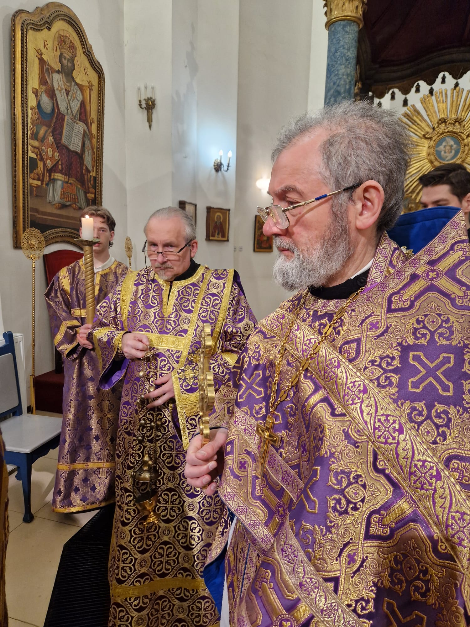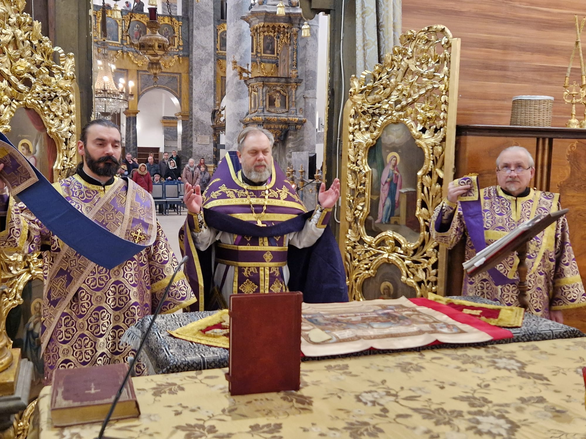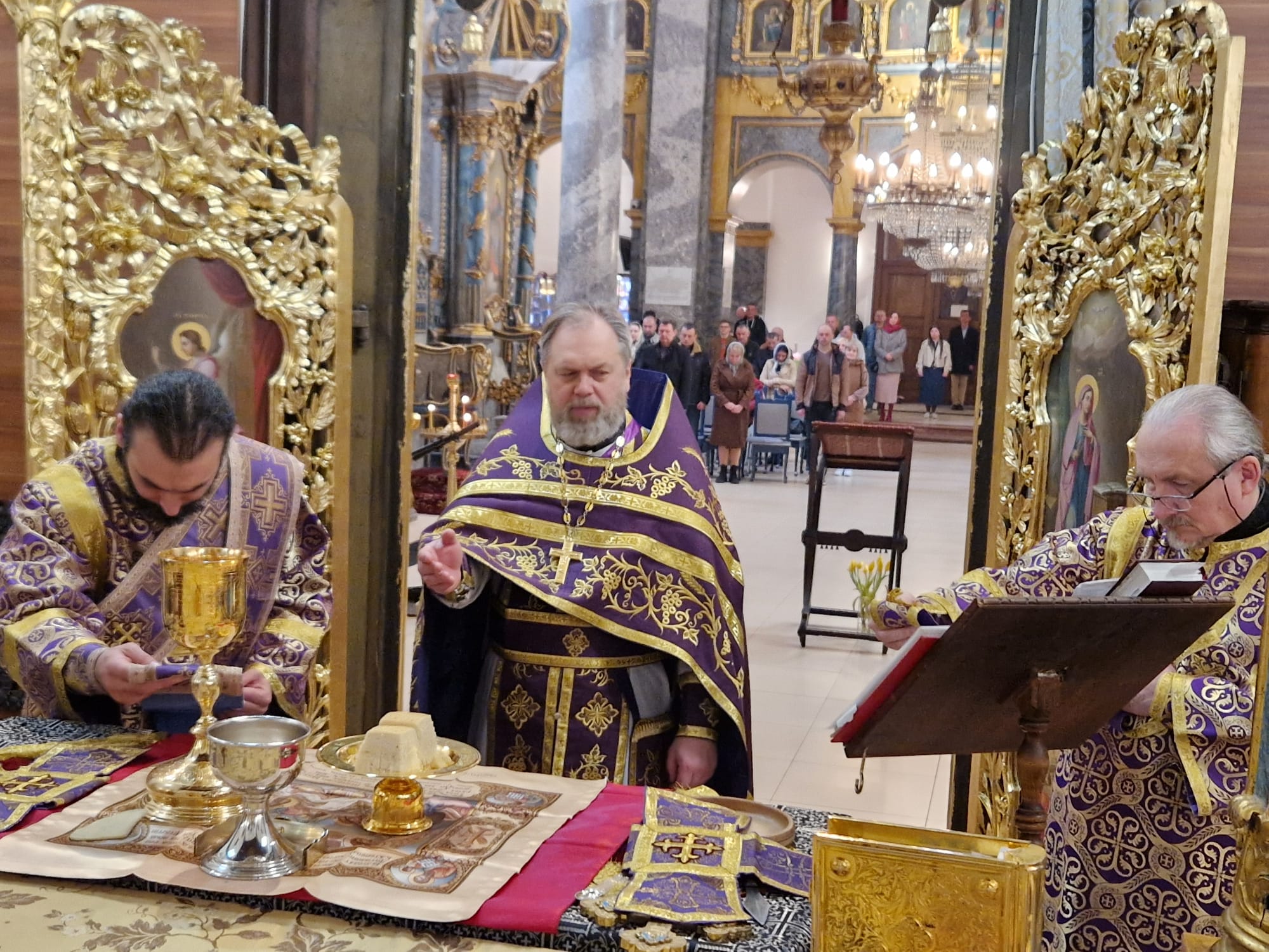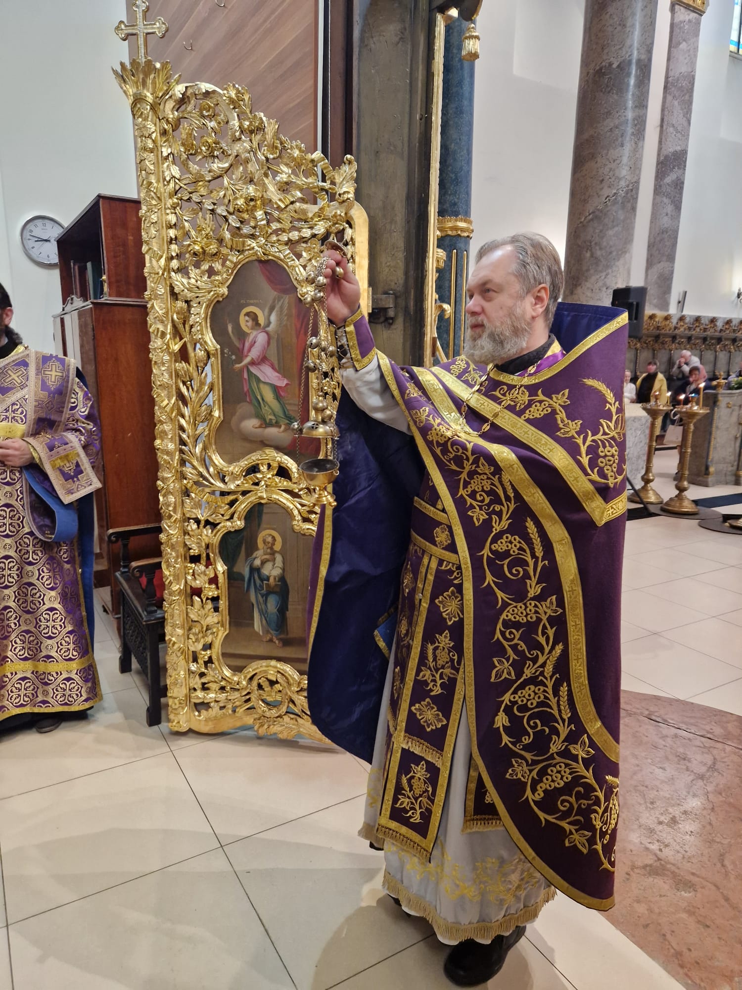 Утром 22 марта 2026 года, в Неделю четвертую Великого поста в Свято- Троицком приходе Успенского кафедрального собора состоялась Божественная литургия, возглавил которую настоятель прихода иерей Димитрий Корнилов в сослужении священника прихода Святослава Булаха, диаконов Стефана Вайна-Элиаш и Геннадия Румянцева.