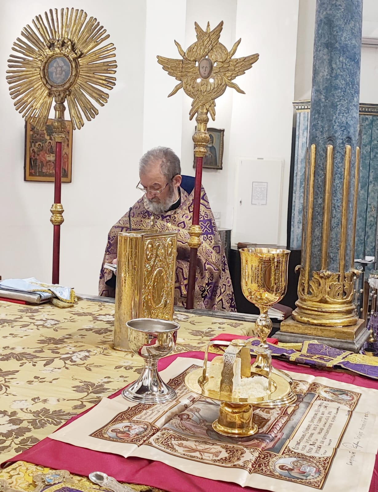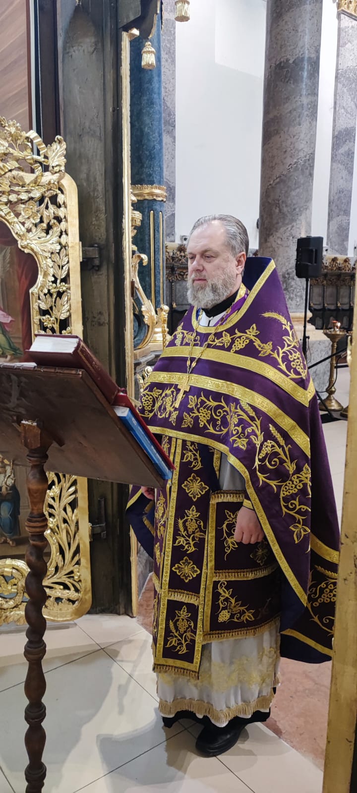 Верующие собрались в храме, украшенном в строгом соответствии с традициями Страстной седмицы — сдержанно и торжественно, без лишних украшений, что подчёркивало глубину и скорбь предстоящих событий.