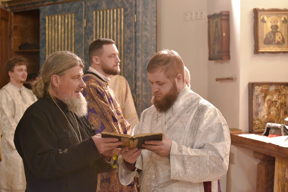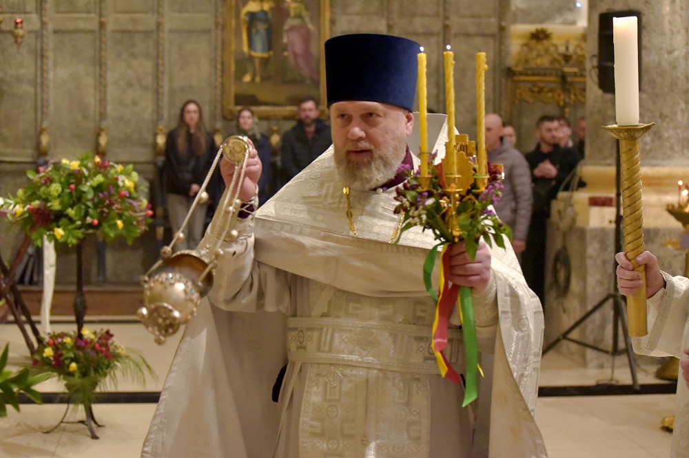 Вечером 12 апреля 2026 года радостнейший и торжественнейший праздник Светлого Христова Воскресения в Свято- Троицком приходе Успенского кафедрального собора состоялась служба Пасхальной великой вечерни, возглавил настоятель прихода иерей Димитрий Корнилов в сослужении священника прихода иерея Святослава Булаха и диакона Геннадия Румянцева.