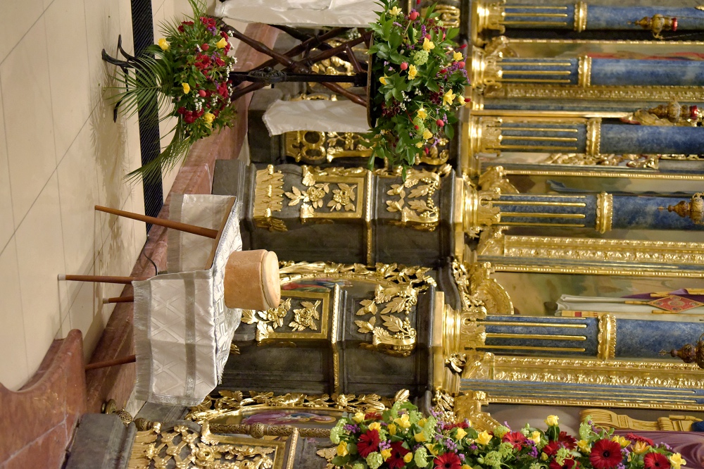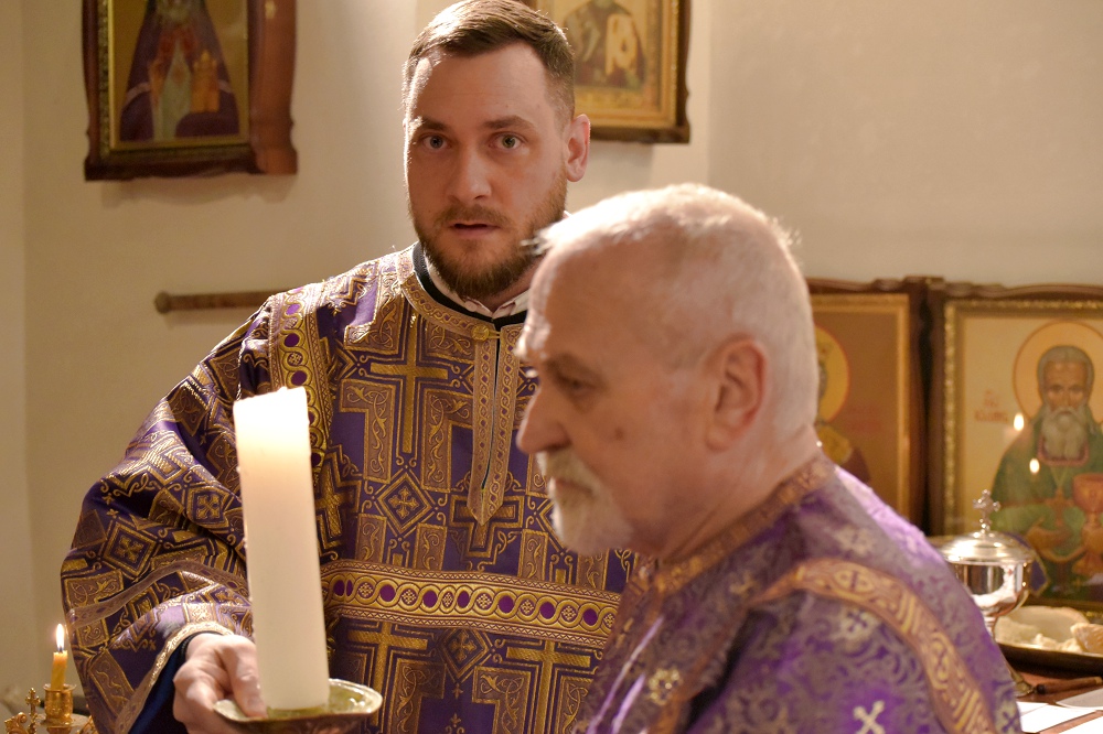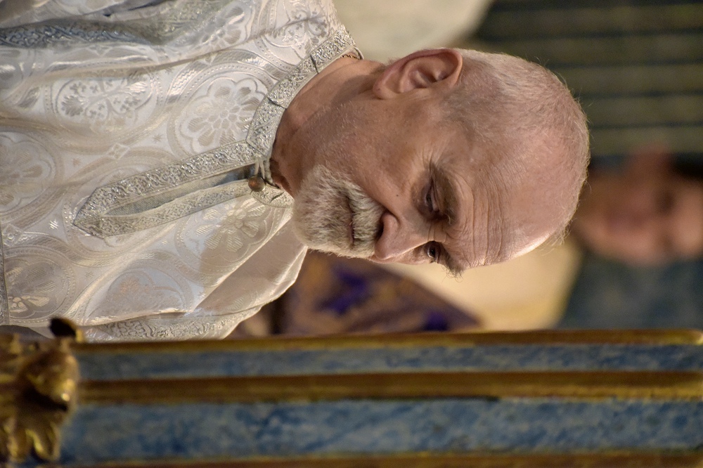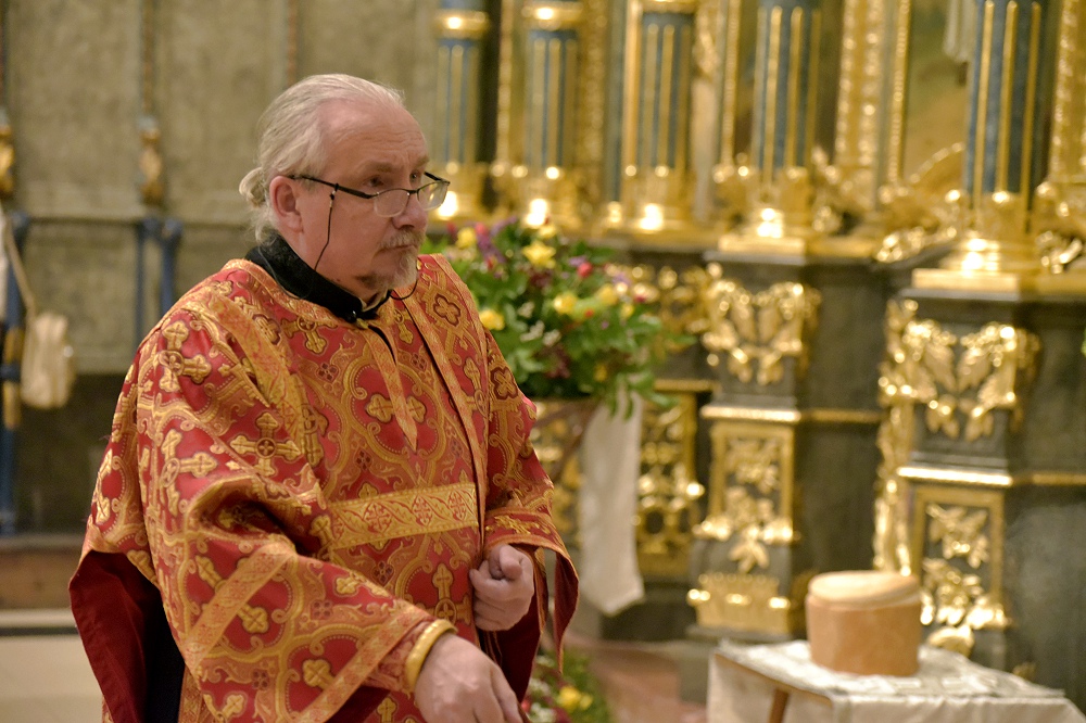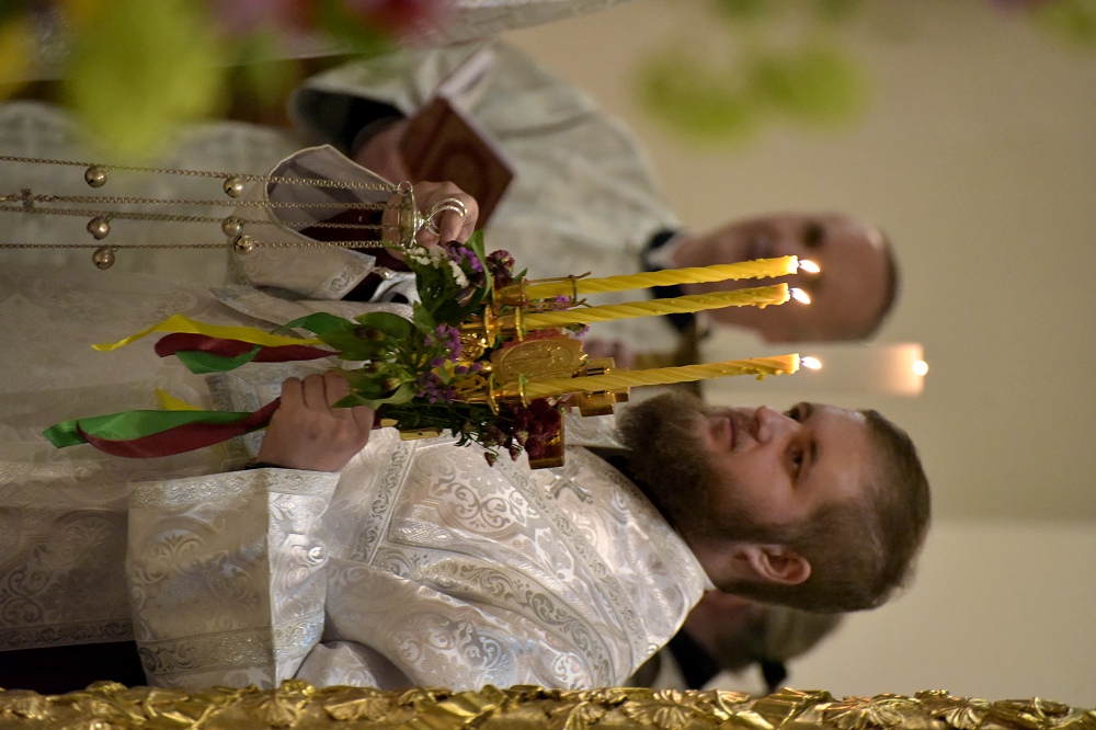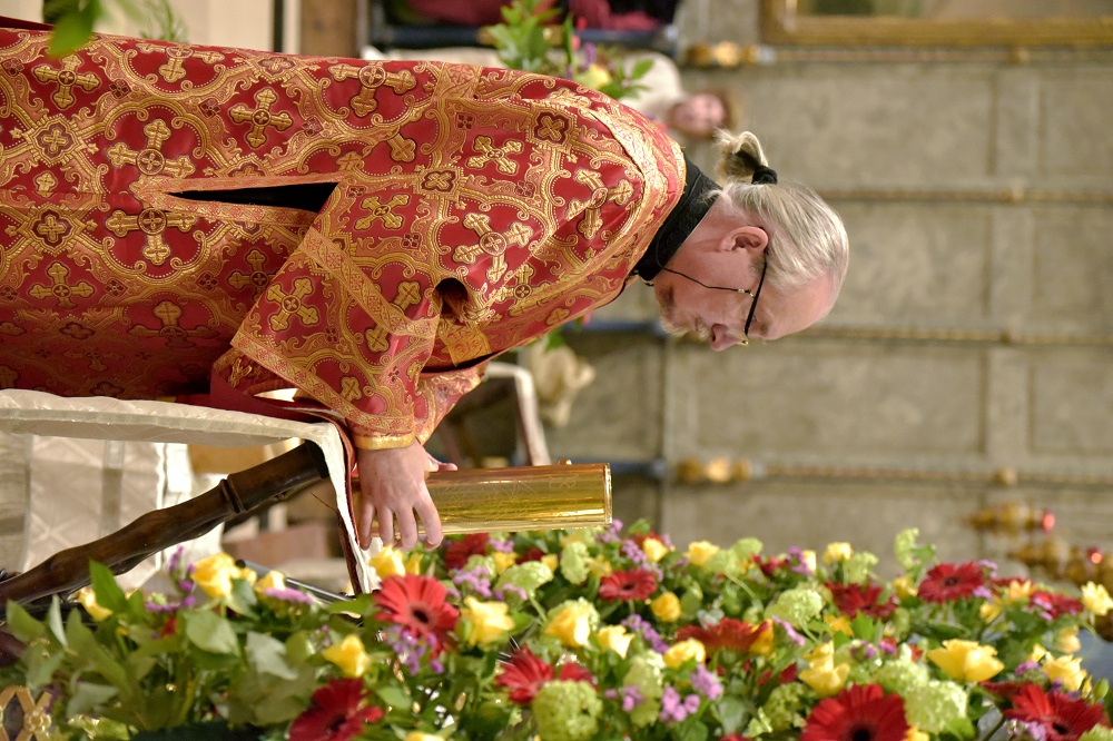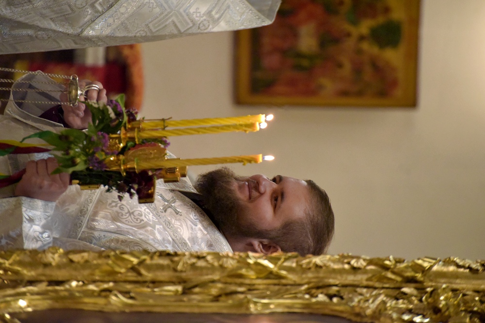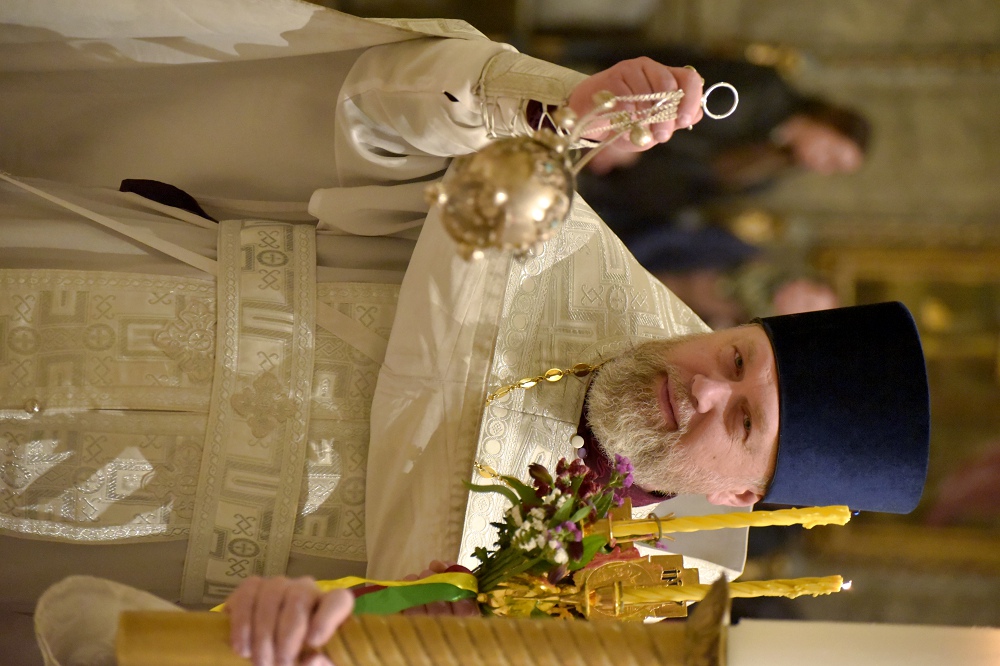 В завершение богослужения, после заамвонной молитвы, у царских врат, перед иконами Спасителя и Божией Матери, были поставлен стол с артосом – особым пасхальным хлебом, в напоминание о том, что Христос сделался для нас Хлебом жизни, после чего, отец Димитрий совершил особый чин его освящения.