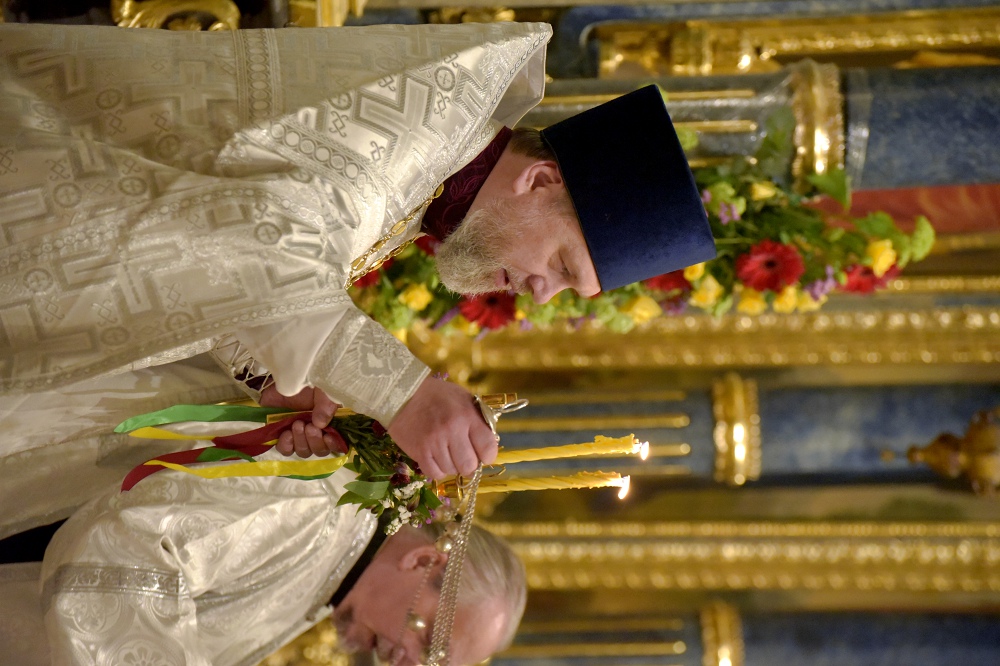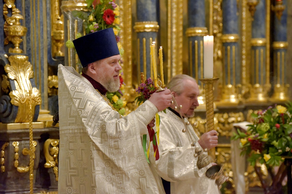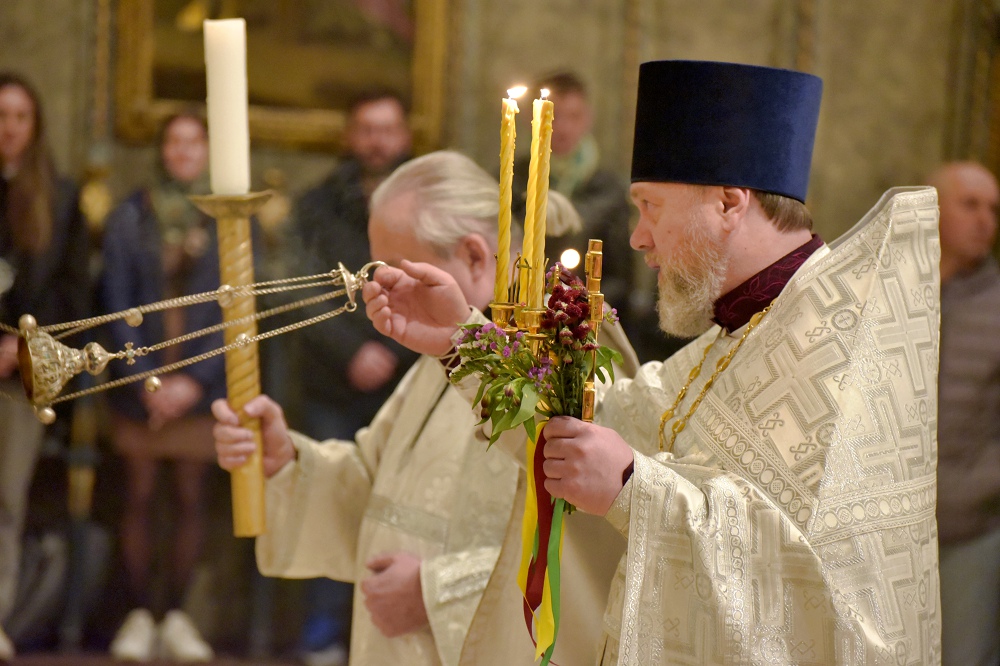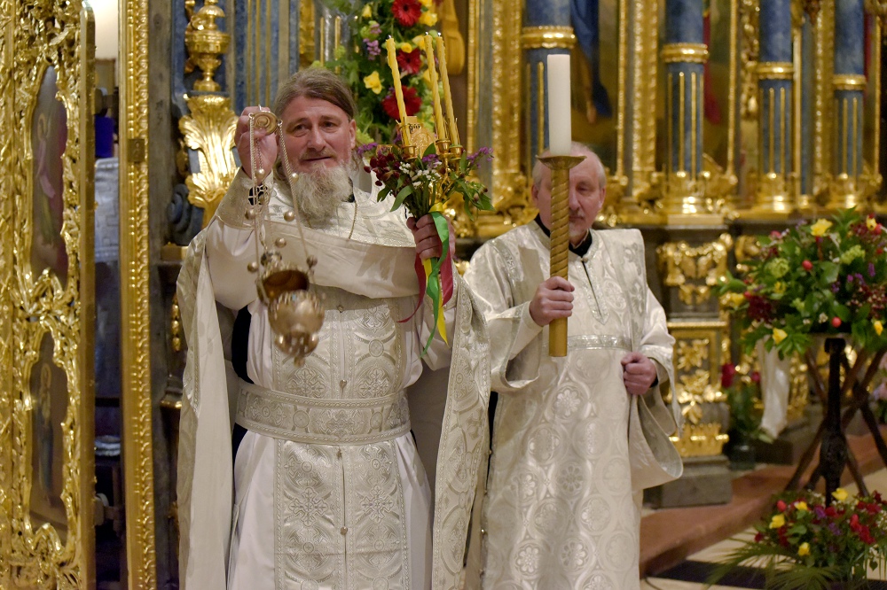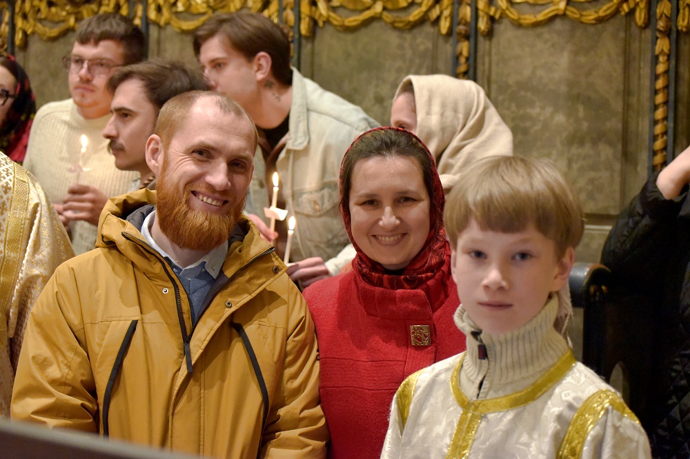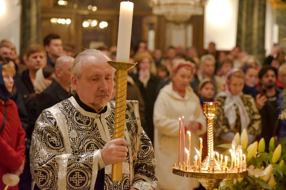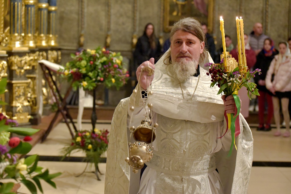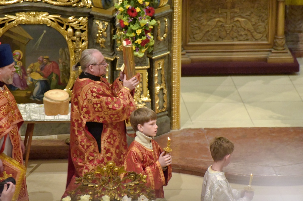 Успенский кафедральный собор вкупе со всей Церковью ныне ликует и радуется, встречая Славное Воскресение Христово. Вся единая соборная семья приходит ныне к Престолу Божию, в храм, чтобы в духовном веселии приобщиться Животворящих Таин Христовых и вознести благодарение Воскресшему Господу за совершенное спасение рода человеческого.