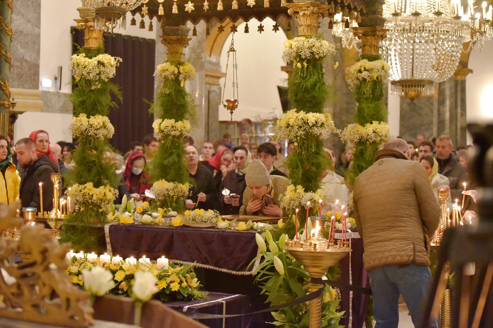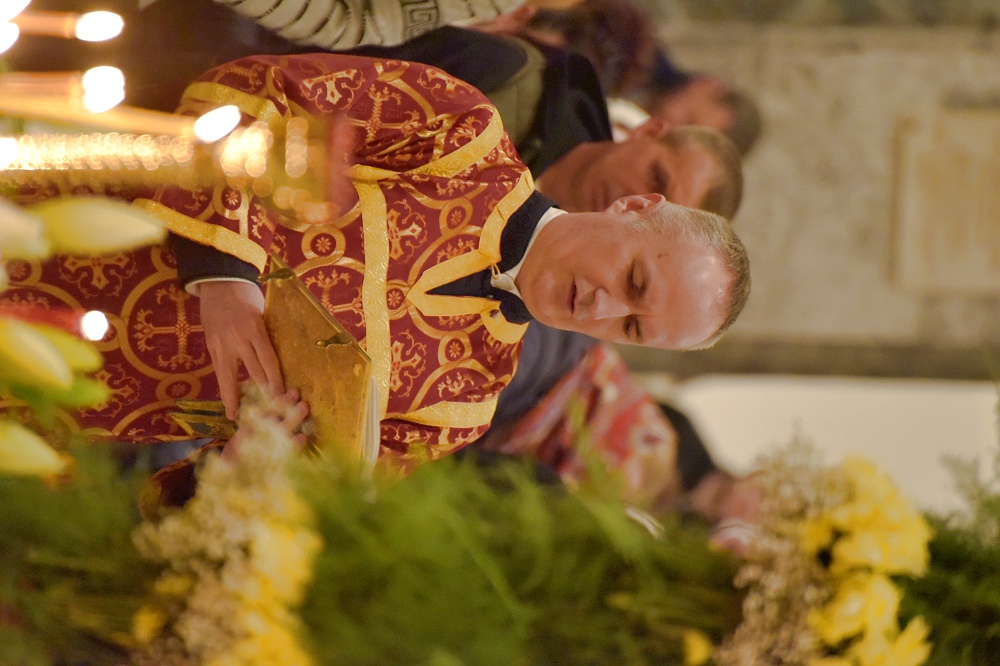 До начала Пасхального богослужения, в полумраке храма, у Святой Плащаницы, алтарники начали читать Книгу Деяний святых апостолов, содержащую непреложные свидетельства истины Воскресения Христова. Затем священнослужители приступили к совершению полунощницы перед пасхальной заутреней с пением канона Великой Субботы. На 9-ой песне канона Плащаница была торжественно перенесена в алтарь и положена на Святом престоле до отдания Пасхи в воспоминание сорокадневного пребывания Господа на земле по Своем Воскресении.