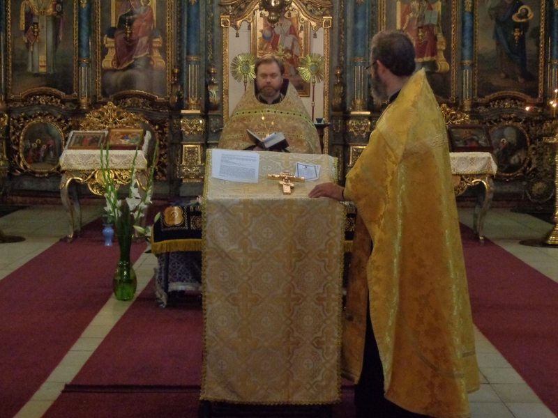 В этот день в Успенском соборе был отслужен молебен иереем Димитрием Корниловым в сослужении иерея Святослава Булаха и нашего гостя из г. Москвы протоиерея Константина Михайлова, благочинного Зеленоградского округа, настоятеля храма Николая Мирликийского.