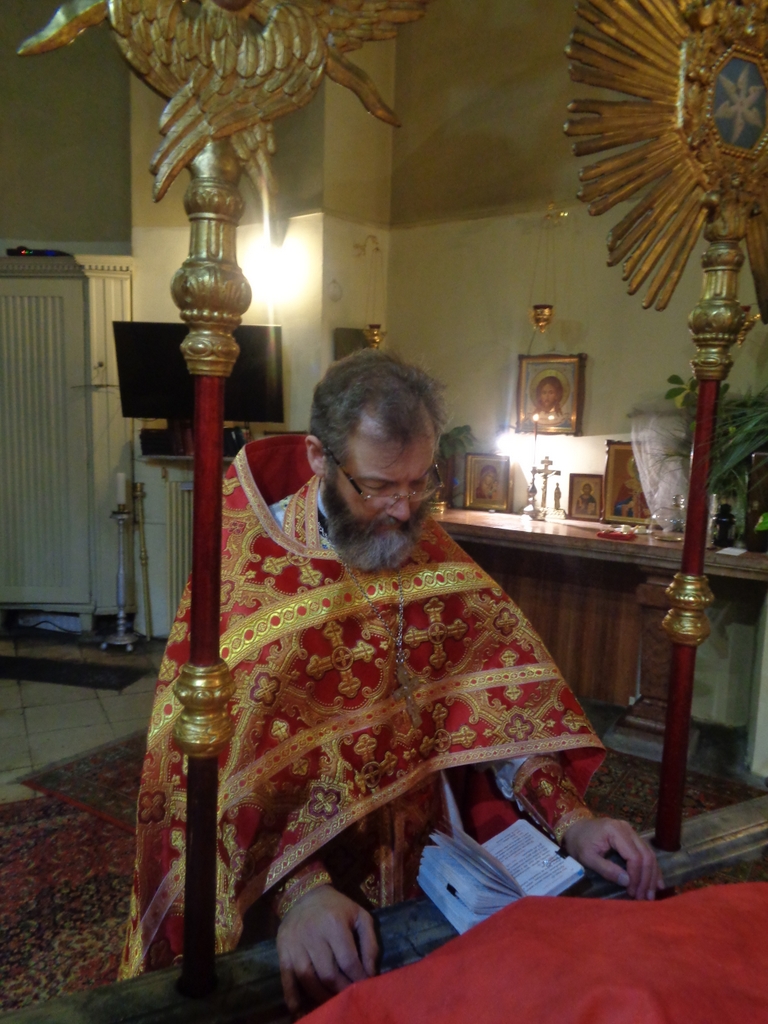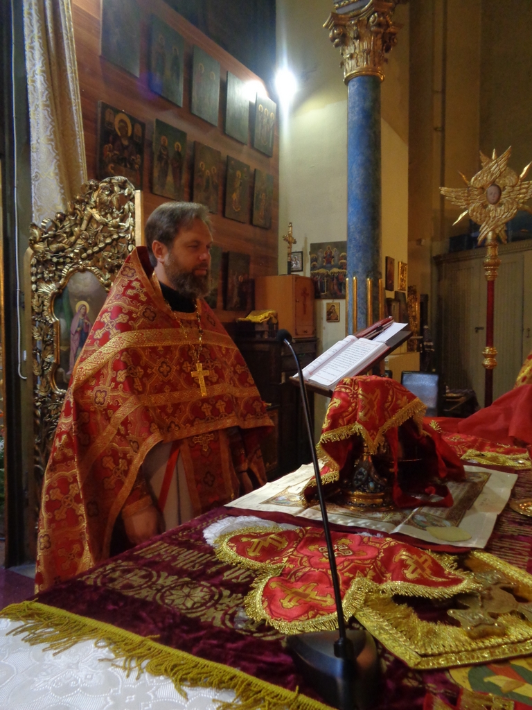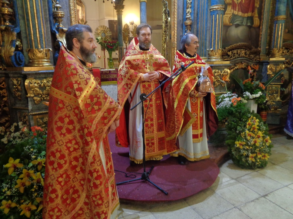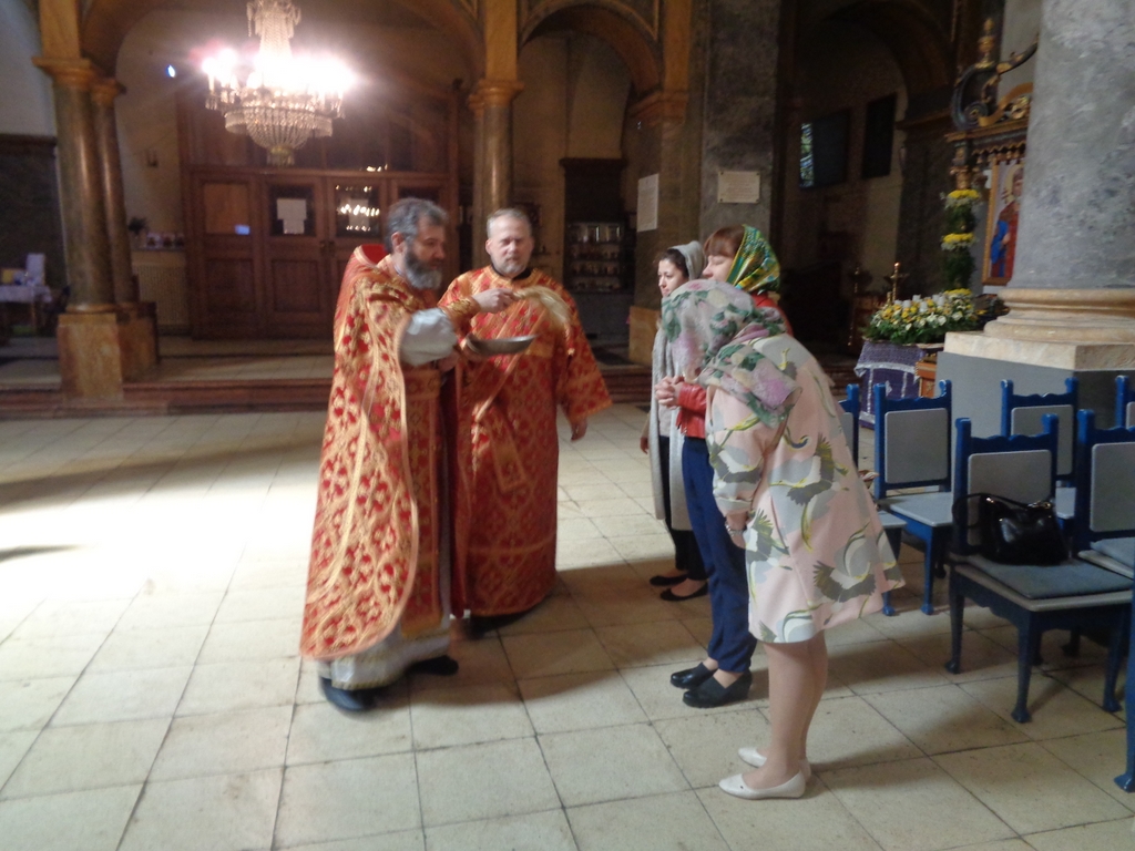 Затем отец Димитрий поздравил всех молящихся со светлыми днями Святой Пасхи и обратился к представителям братского прихода из Хевиза, со словами благопожеланий по случаю их престольного праздника. Хевизский настоятель сердечно благодарил настоятеля и прихожан Троицкого прихода, и напомнил, что в прошлом году оба прихода вместе отмечали этот праздник в Хевизе, а теперь в Будапеште.