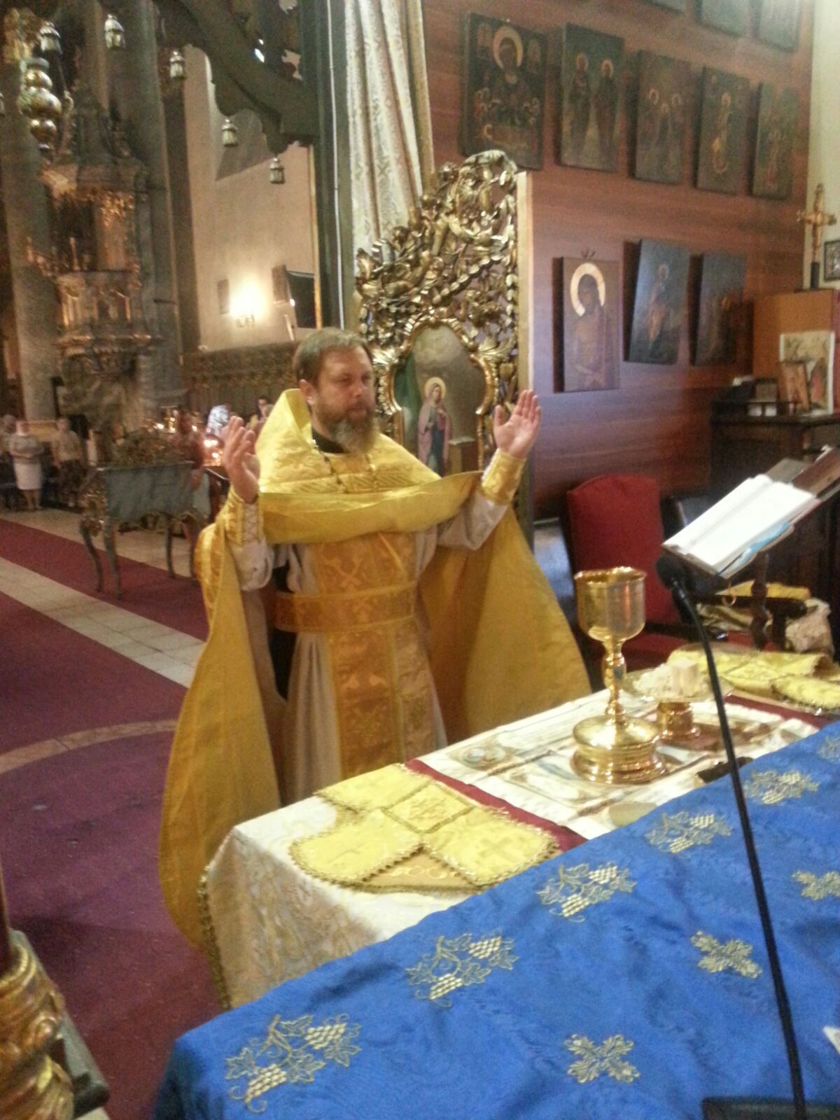 7 августа 2016 года, в Неделю 7-ю по Пятидесятнице, святой праведной Анны, матери Пресвятой Богородицы, настоятель Свято-Троицкого прихода иерей Димитрий Корнилов, совершил Божественную литургию в Успенском кафедральном соборе г. Будапешта.