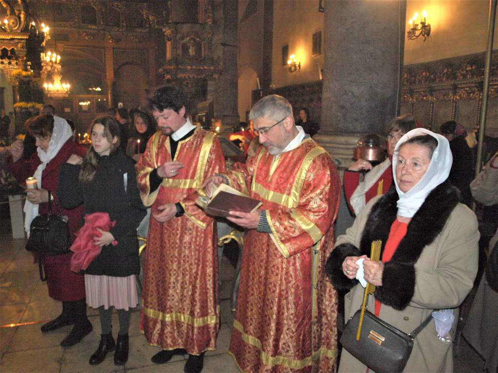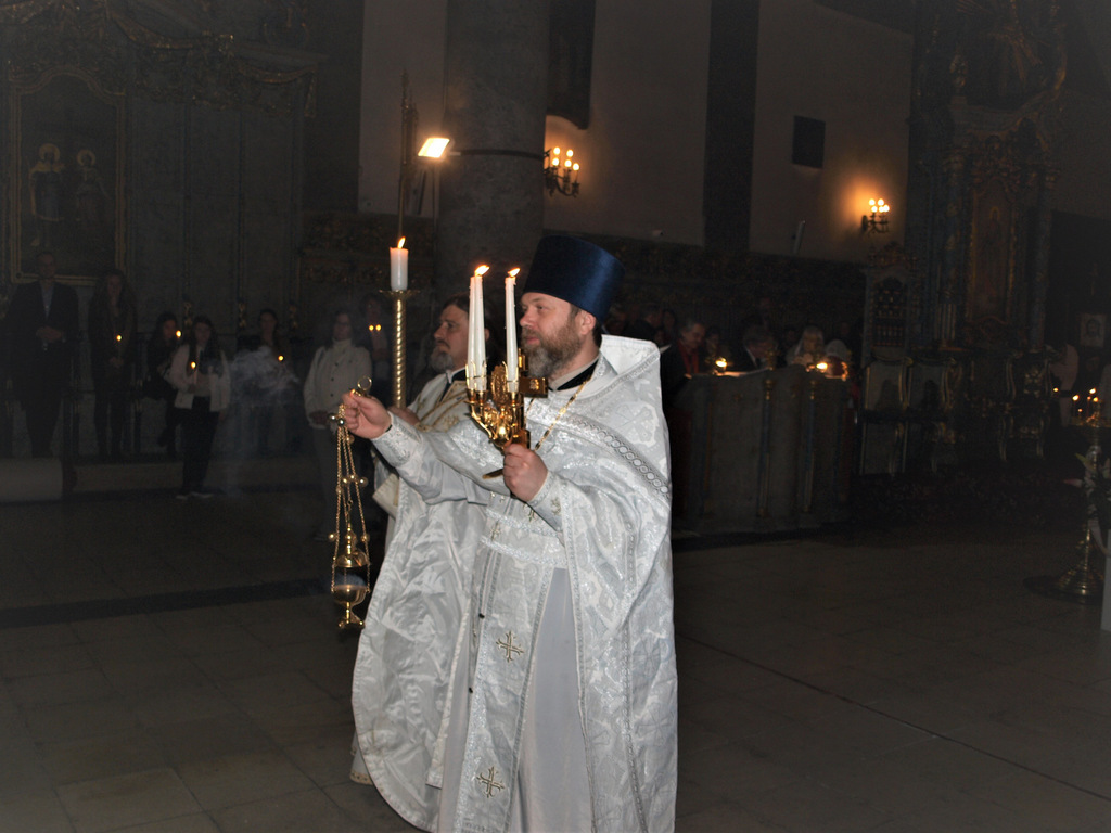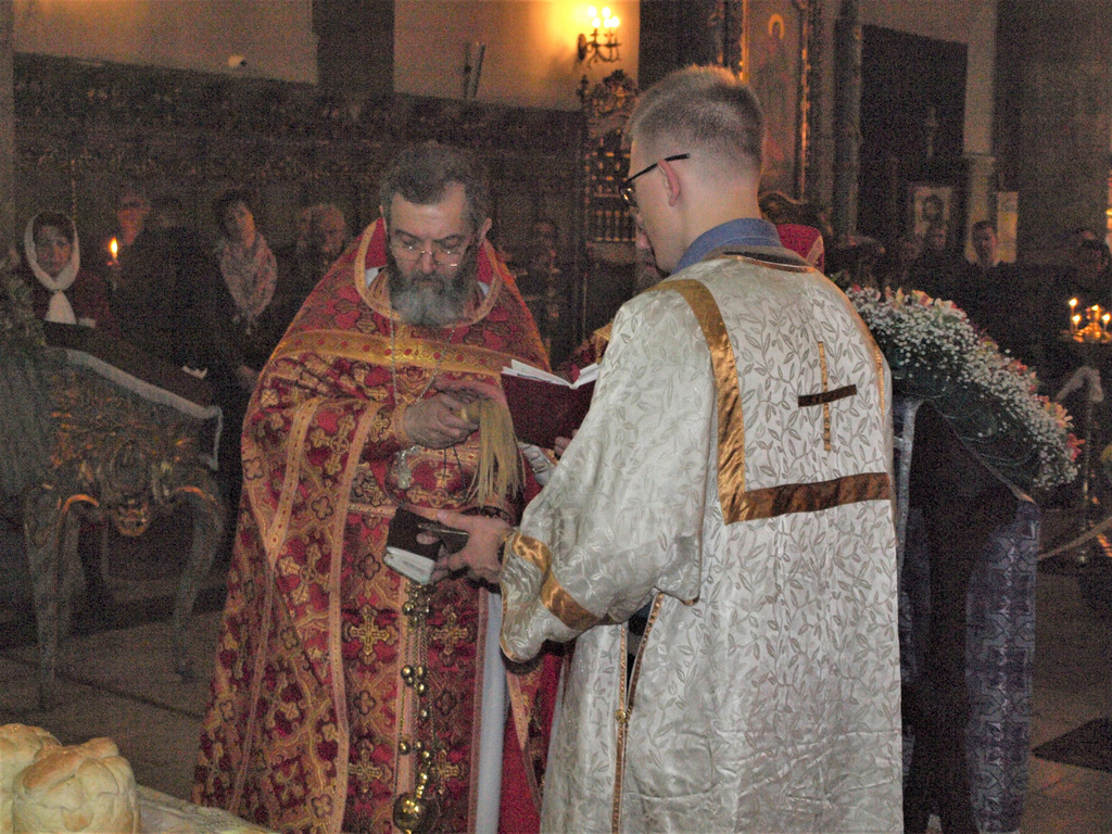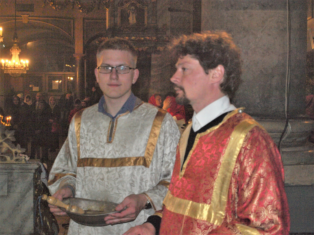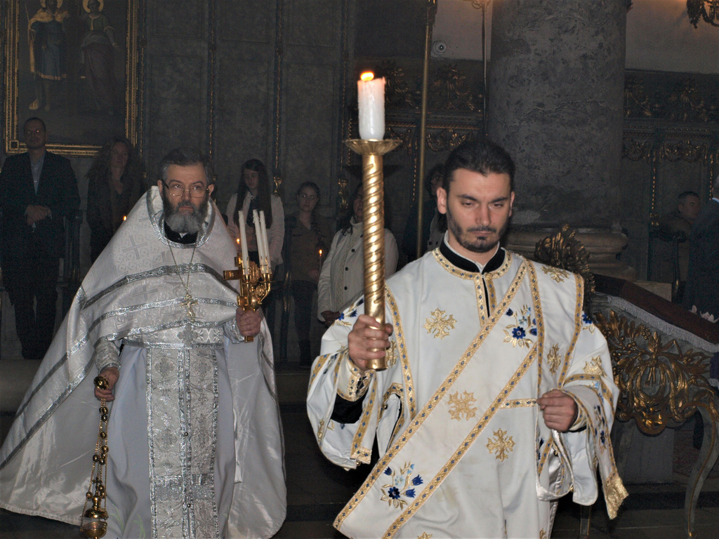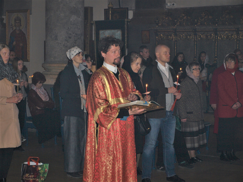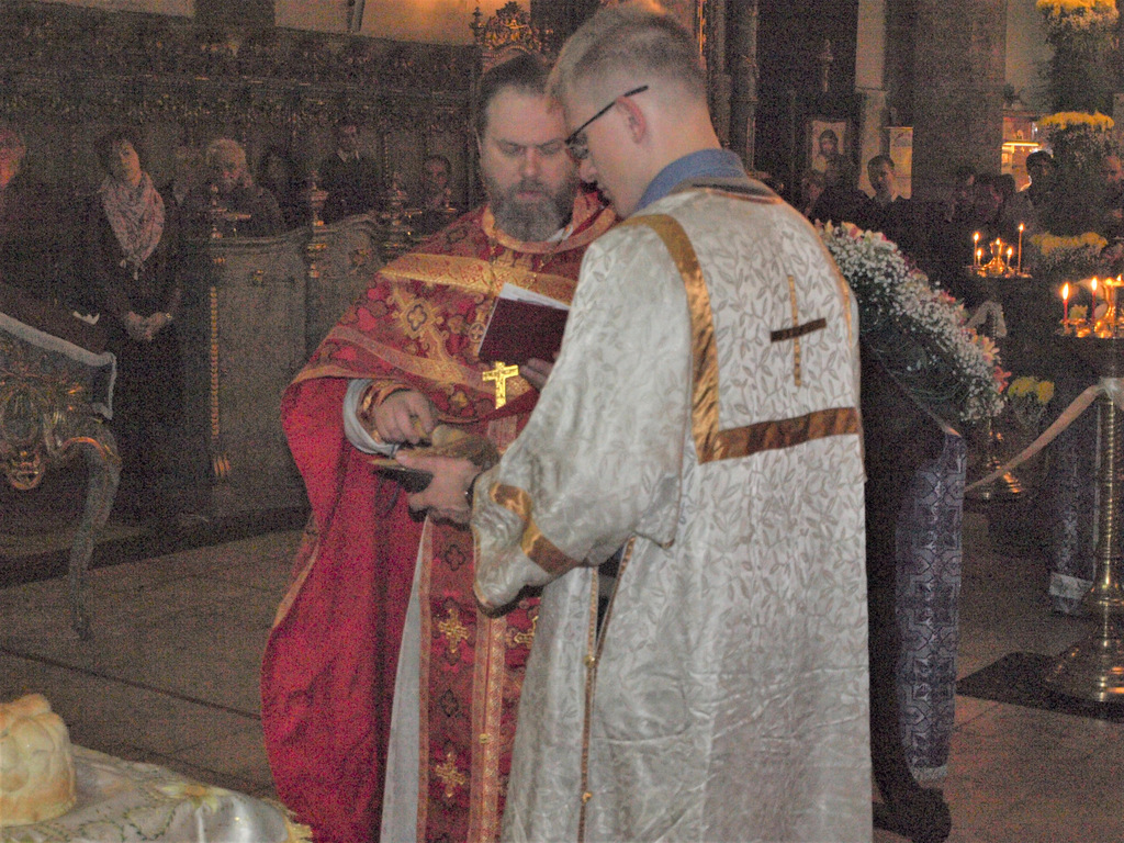 После, сразу началась ночная Божественная литургия которую возглавил отец Димитрий, ему сослужили помощник правящего архиерея Святослав Булах и диакон Стефан Вайно-Элиаш.