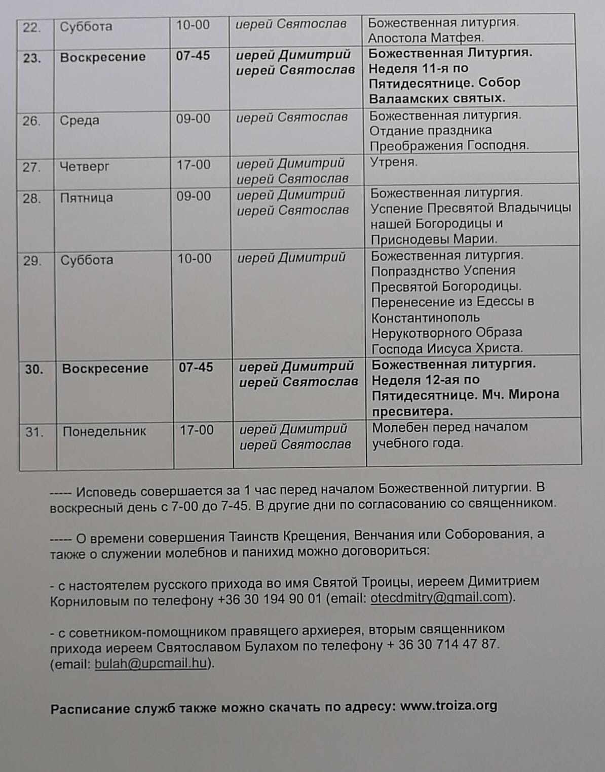 М А Й 2021 г. РАСПИСАНИЕ БОГОСЛУЖЕНИЙ РУССКИЙ ПРИХОД ВО ИМЯ СВЯТОЙ ТРОИЦЫ Г. БУДАПЕШТА Богослужения совершаются на церковно-славянском языке, по старому стилю в соборе Успения Пресвятой Богородицы г. Будапешта. Настоятель прихода иерей Димитрий Корнилов тел. +36 30 194 90 01. Еmail: otecdmitry@gmail.com 1. Великая Суббота 23-30 иерей Димитрий иерей Святослав Полунощница. Пасхальная заутреня (на ц-славянском, языке). ПАСХА. 2. Светлое Христово Воскресение 09-00 иерей Димитрий иерей Святослав Божественная Литургия на церковно-славянском языке. ПАСХА. Освящение артоса. 4. Вторник Светлой седмицы 17-00 иерей Димитрий Великая вечерня. 7. Пятница Светлой седмицы 09-00 иерей Святослав…
